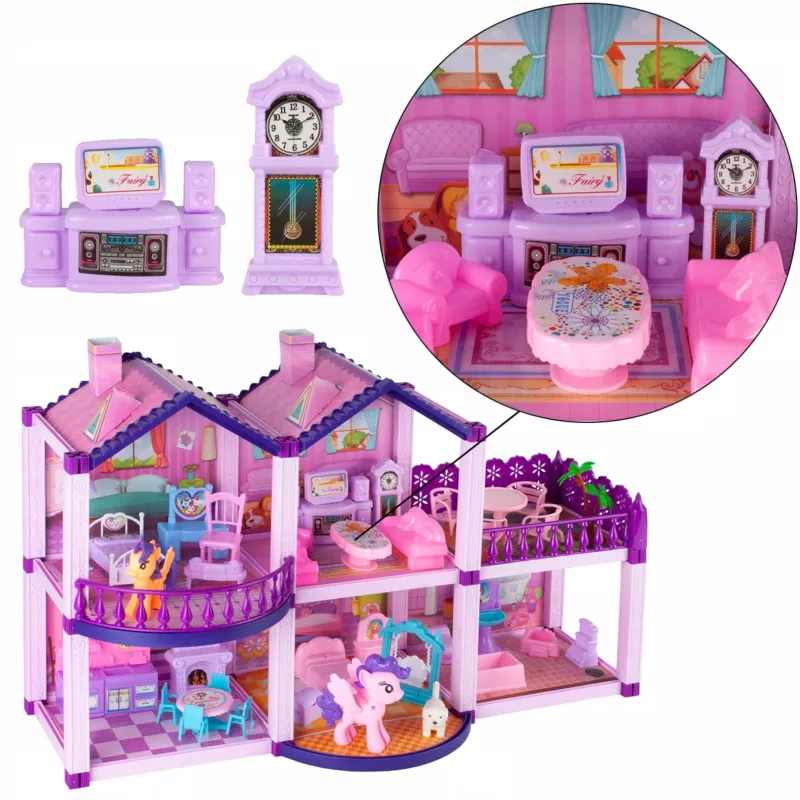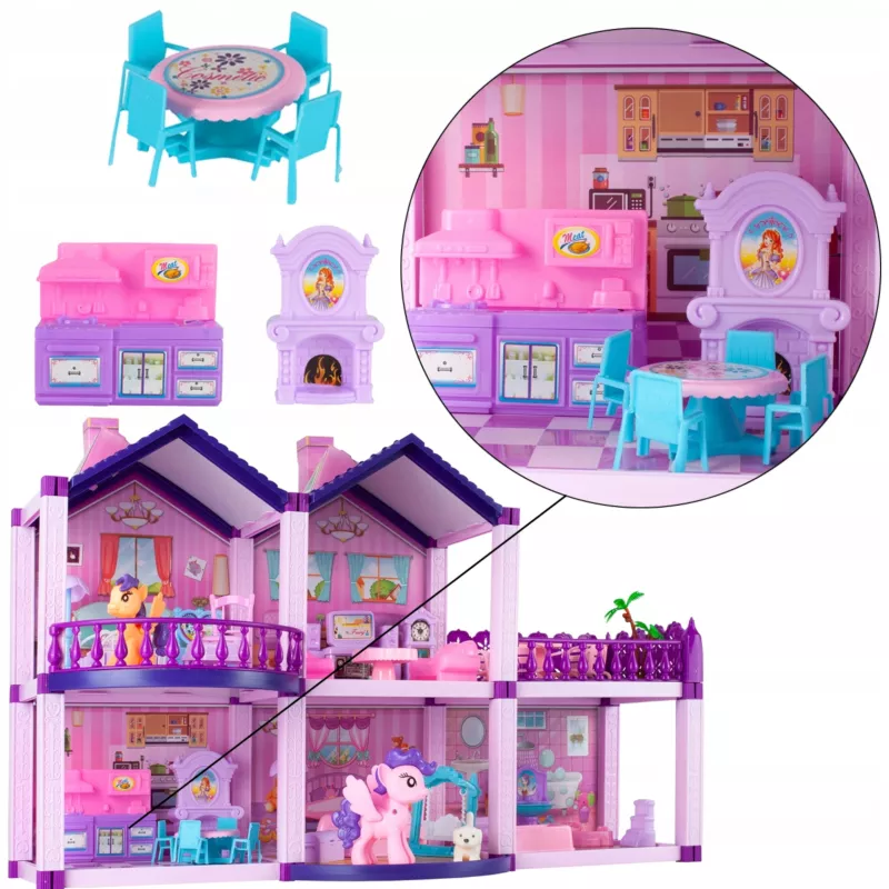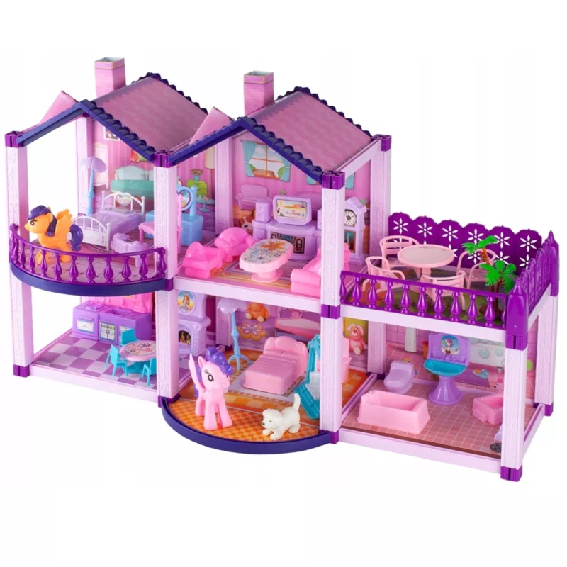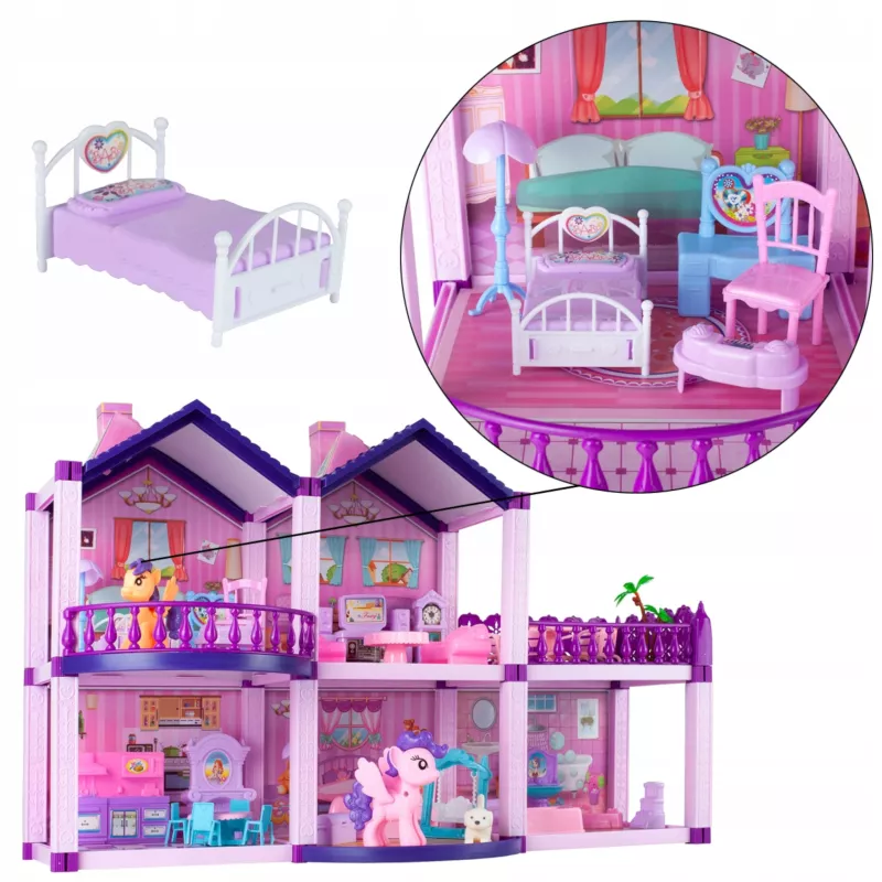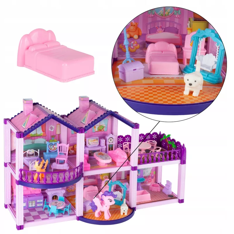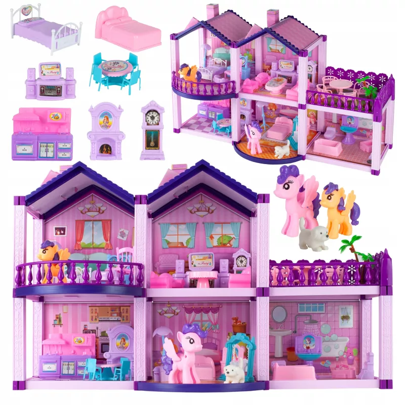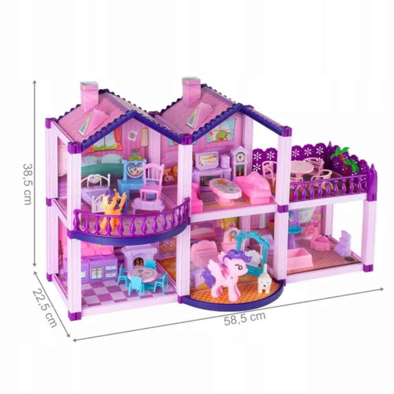 Domek dla lalek różowy duży piętrowy z mebelkami kucyki koniki dla dzieci