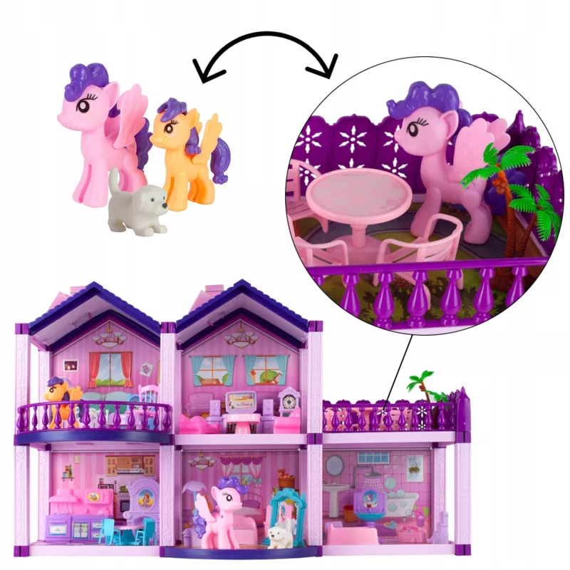W komplecie są figurki 2 kucyków i pieska, a także pełne wyposażenie domu: kuchnia, stoły i krzesełka, łóżka, toaletki, wanna, kominek, huśtawka, lampy i dekoracje. Dziecko może codziennie aranżować domek inaczej.