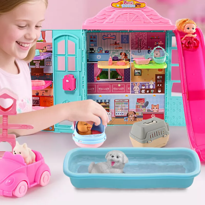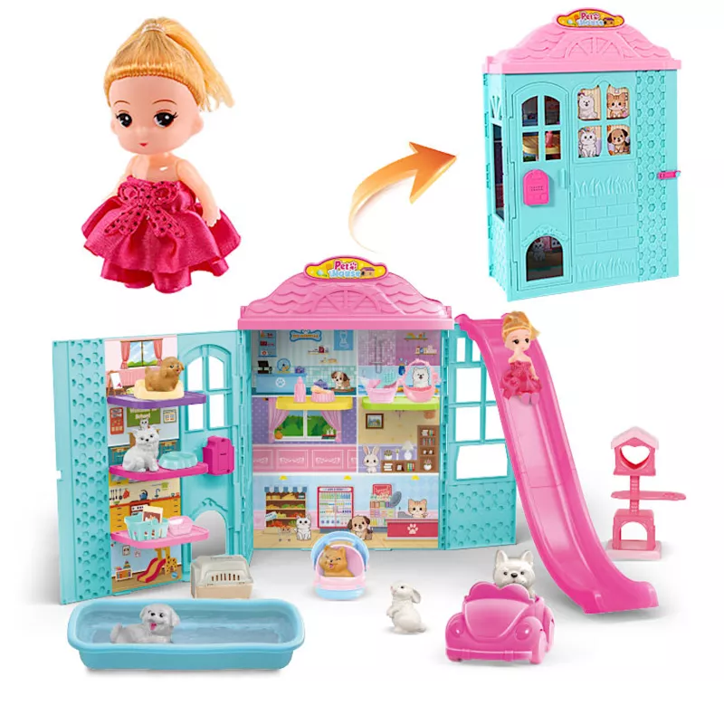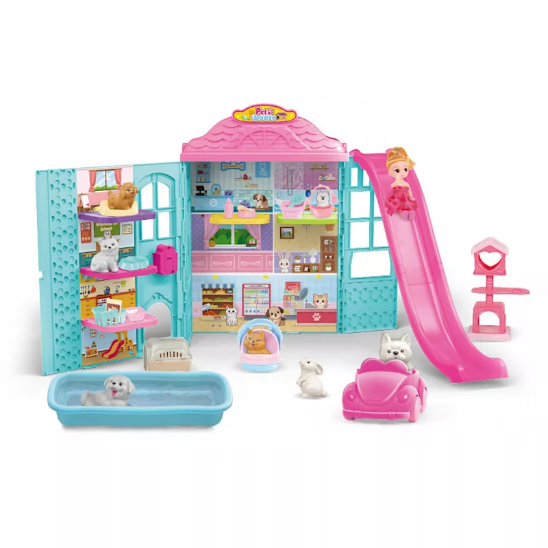 Zaskocz swoje dziecko składanym domkiem dla lalek ze zwierzątkami i zjeżdżalnią!