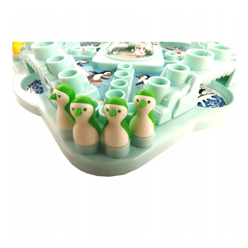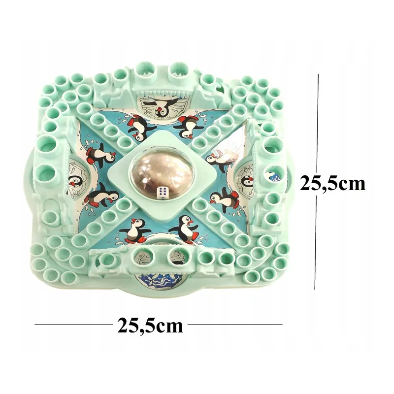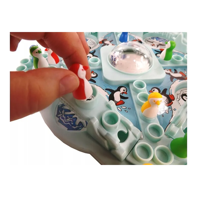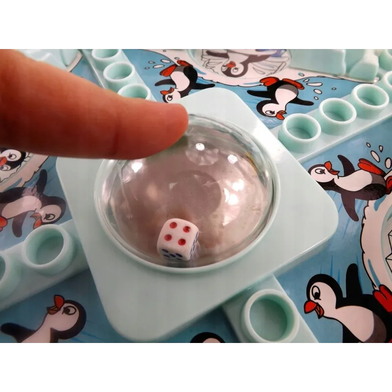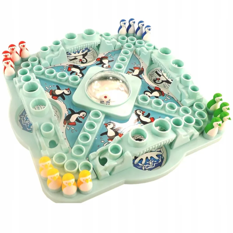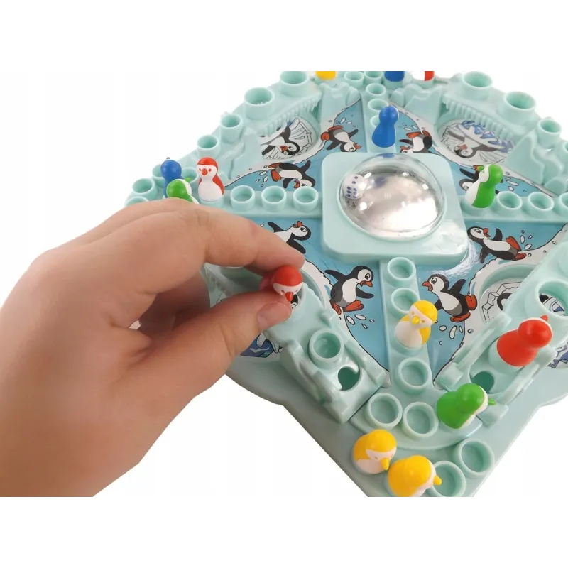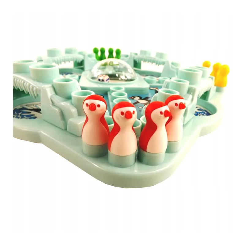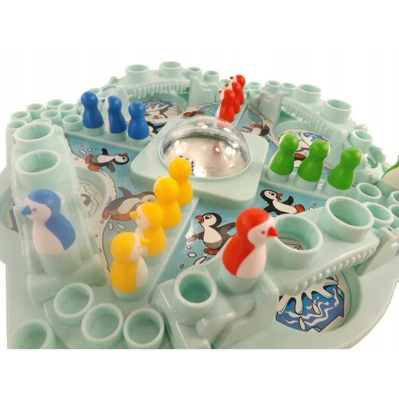 Jak grać? Na planszę należy nałożyć w odpowiednim miejscu mosty, przesuwając ruchome wkładki w mostach tak aby pułapki były niewidoczne. Każdy gracz wybiera 4 pingwiny w tym samym kolorze (żółty, czerwony, niebieski, zielony) i ustawia w swoim narożniku. Grę rozpoczyna gracz, który wyrzuci 6 oczek. Kostka jest zamknięta w półkuli i nie ma obawy, że gdzieś zaginie. Pingwiny poruszają się zgodnie z ruchem wskazówek zegara o ilość oczek wskazanych przez kostkę. Niezwykła zabawa właśnie się zaczyna !!! W czasie trwania jednej tury, każdy gracz może poruszać się tylko jednym pingwinem, chyba że za każdym razem wyrzuci na kostce 6 oczek. Wtedy może wprowadzić do gry kolejne pingwiny.