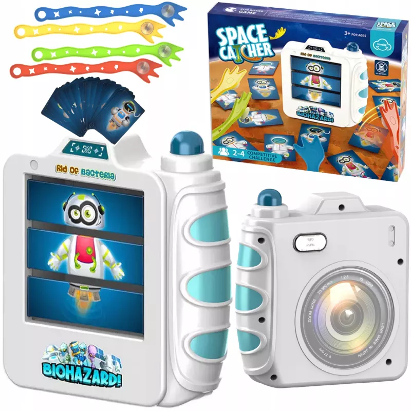 Kolorowe karty, interaktywny aparat oraz łapki z przyssawkami zapewniają emocjonującą rozgrywkę i angażują dzieci już od pierwszej rundy.