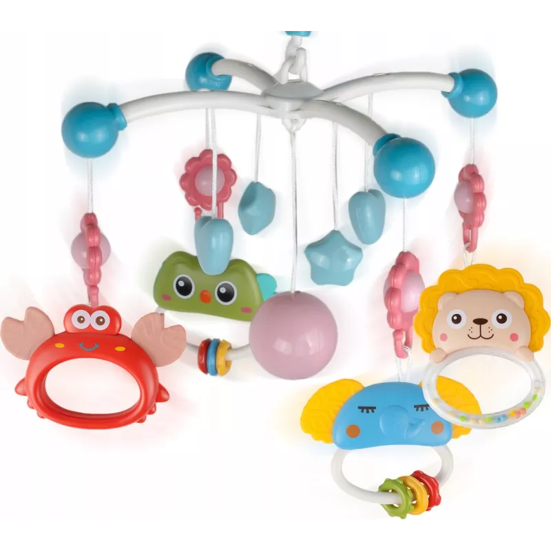 Kolorowe zwierzątka (lew, sowa, słoń, krab) obracają się razem z karuzelką, przyciągają wzrok i można je zdjąć. Dzięki temu karuzelka jest użyteczna także wtedy, gdy dziecko zaczyna chwytać i bawić się w rękach.