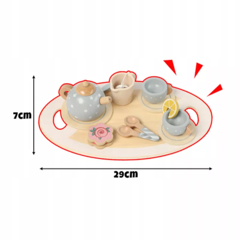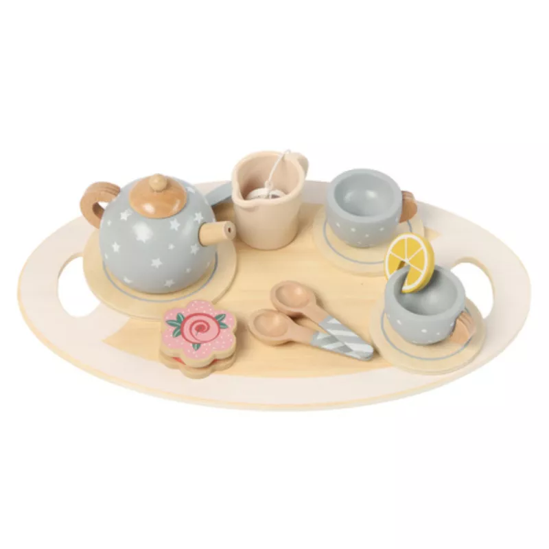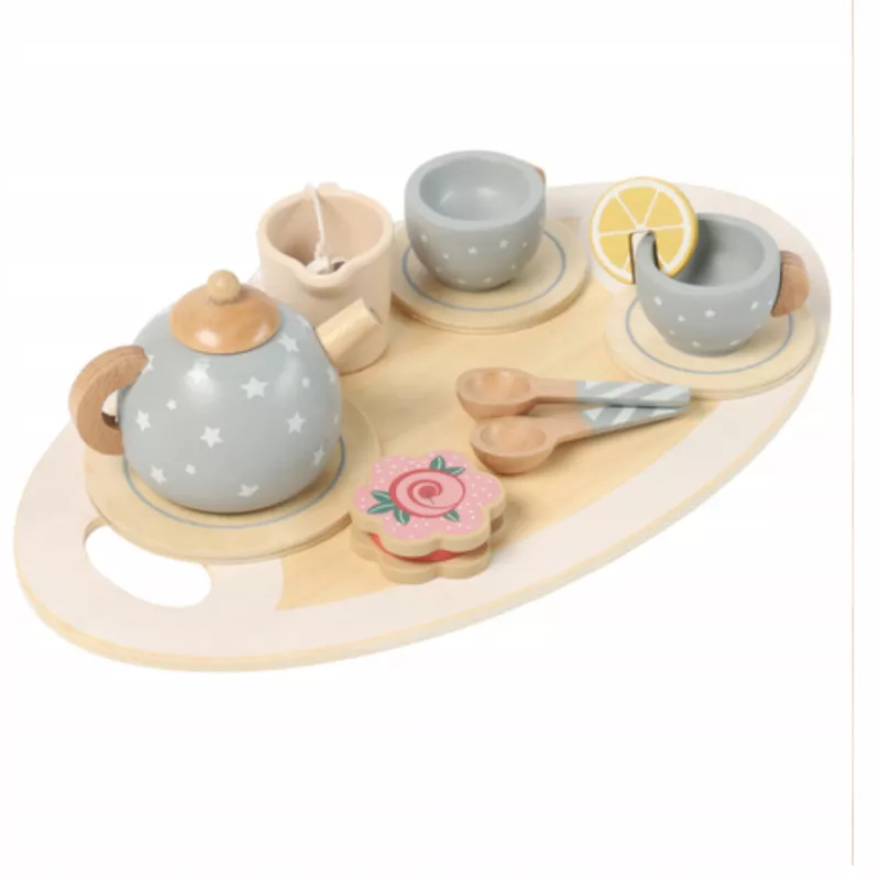 W zestawie jest wszystko, co trzeba: taca, czajniczek z pokrywką, filiżanki, spodki, łyżeczki, ciastka i cytrynka – czyli komplet na „prawdziwą” herbatkę.