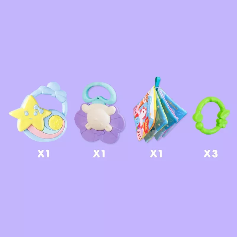 Dzięki plastikowym zapięciom akcesoria można dowolnie przypinać i odpinać, dopasowując zabawkę do wieku i potrzeb dziecka.