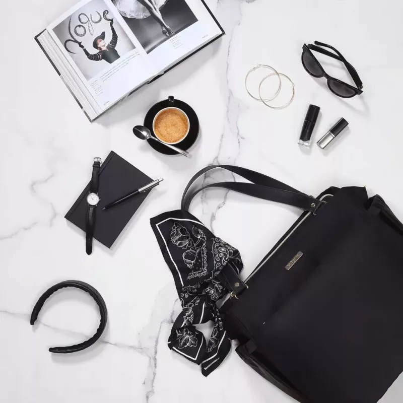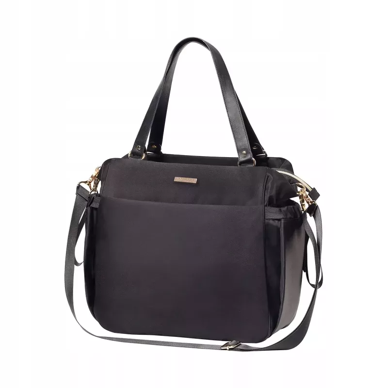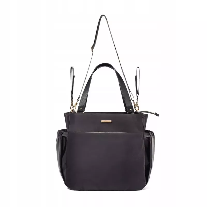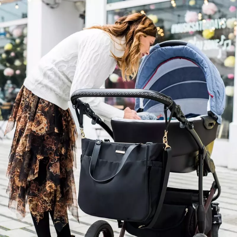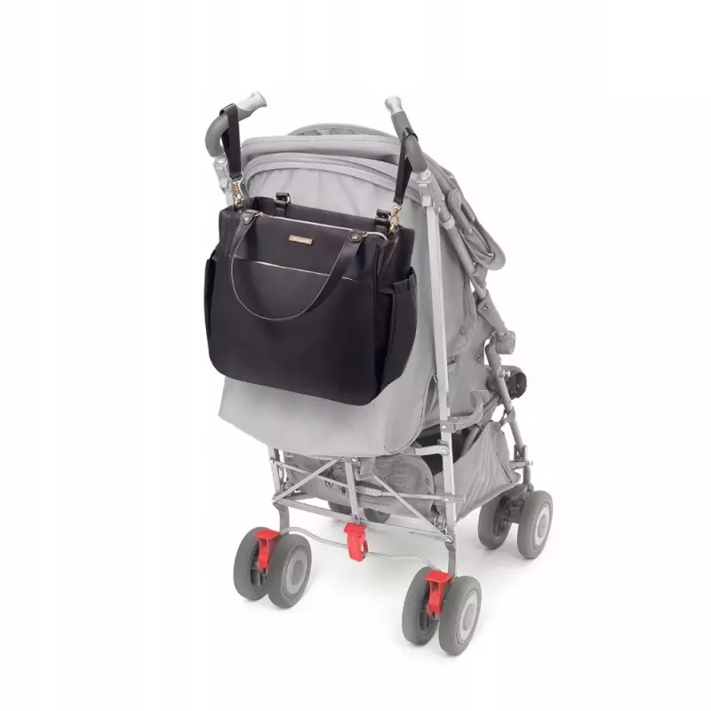 Minimalistyczny design, uniwersalny czarny kolor i eleganckie wykończenia sprawiają, że torba świetnie komponuje się z każdym wózkiem i pasuje do różnych stylizacji – od sportowych po eleganckie.