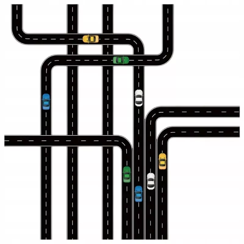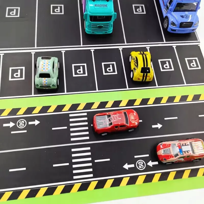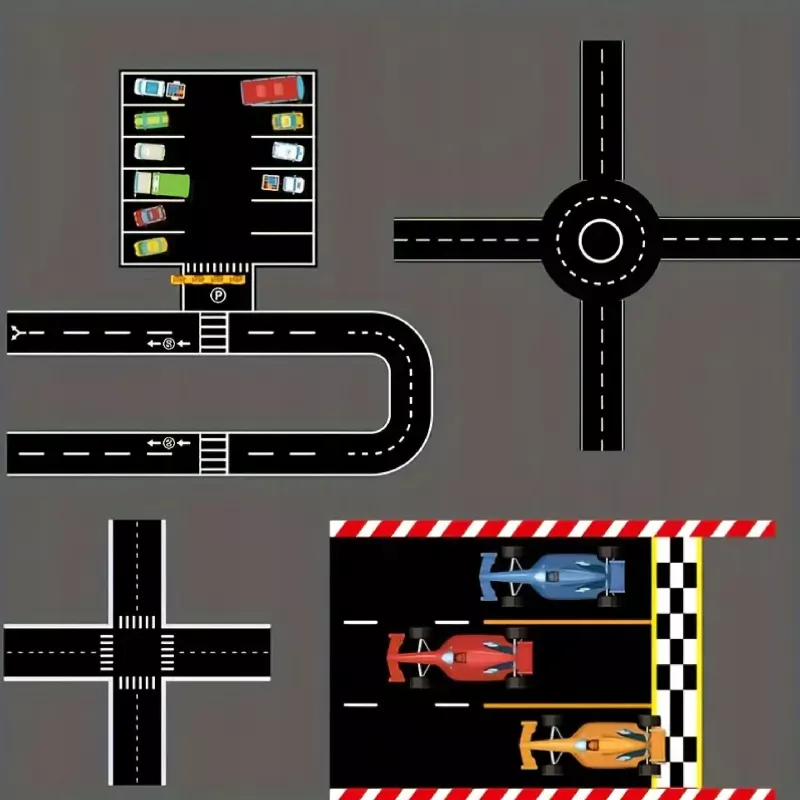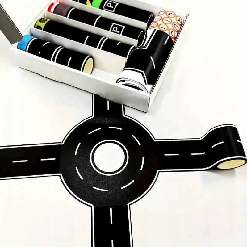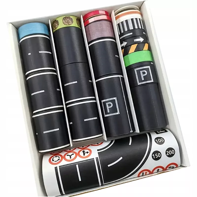 Dzieci mogą projektować własne autostrady, tory, skrzyżowania i parkingi, a dzięki samoprzylepnej papierowej taśmie — łatwo je naklejać, odklejać i modyfikować.