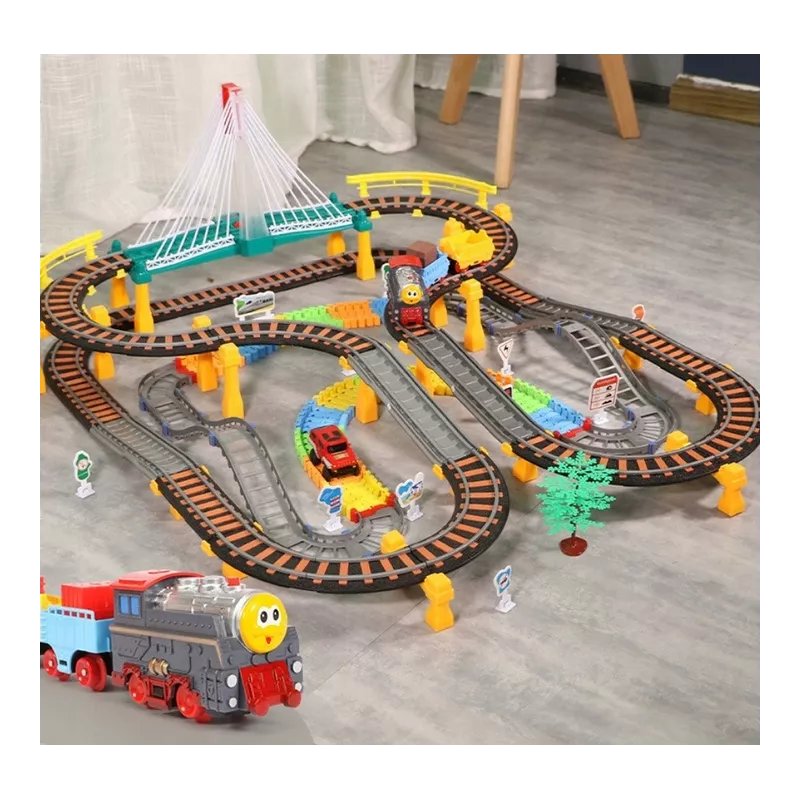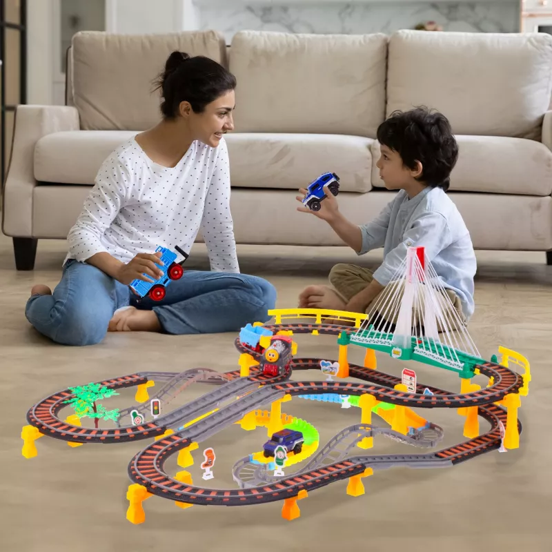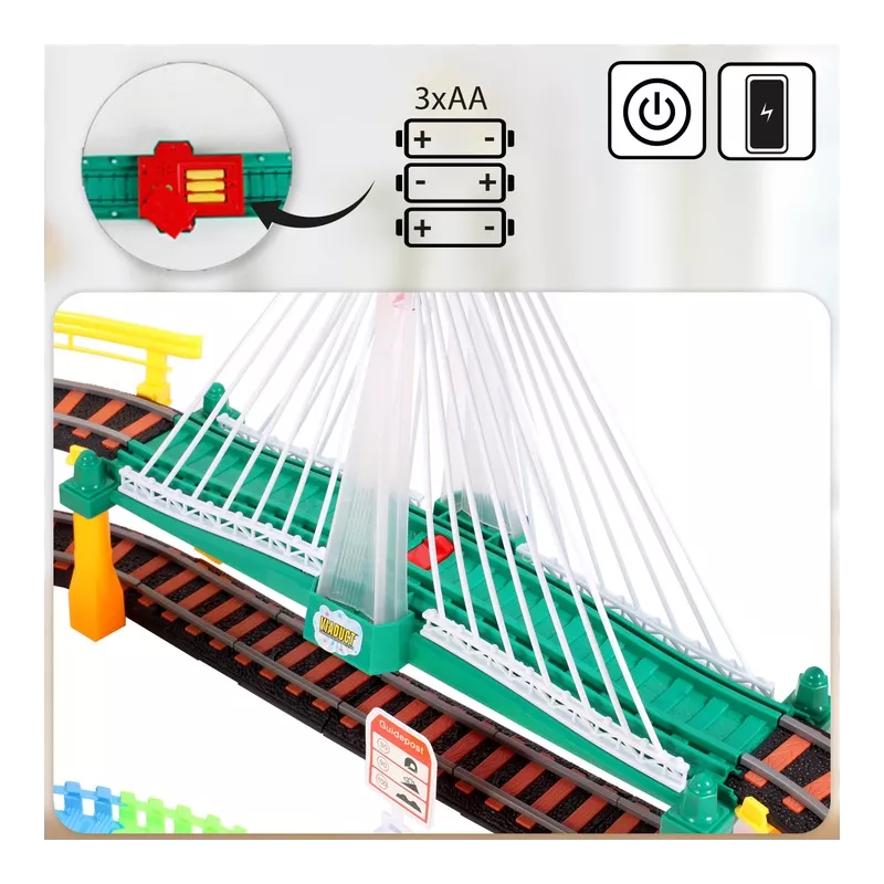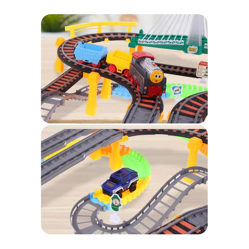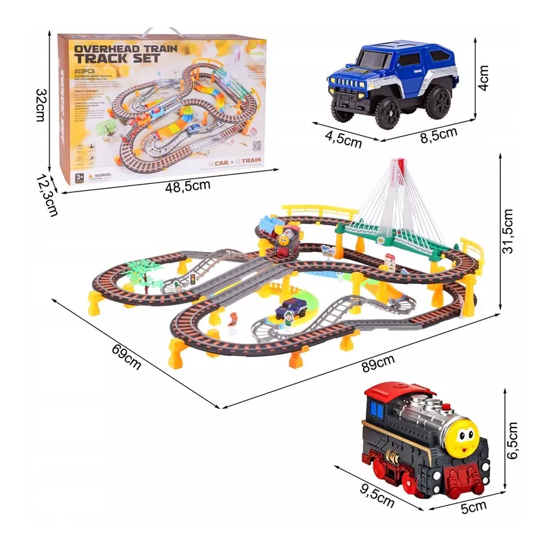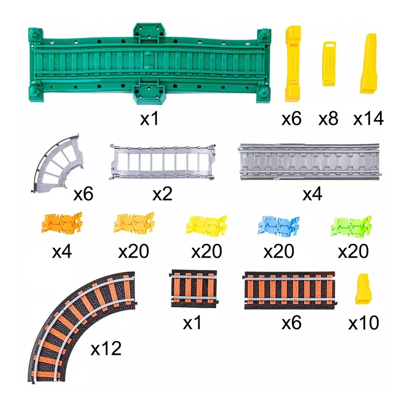 Zestaw składa się z 192 elementów, w tym: dwupoziomowego toru kolejowego, toru samochodowego, świecącego mostu, wagonów, auta i akcesoriów takich jak znaki czy drzewka.