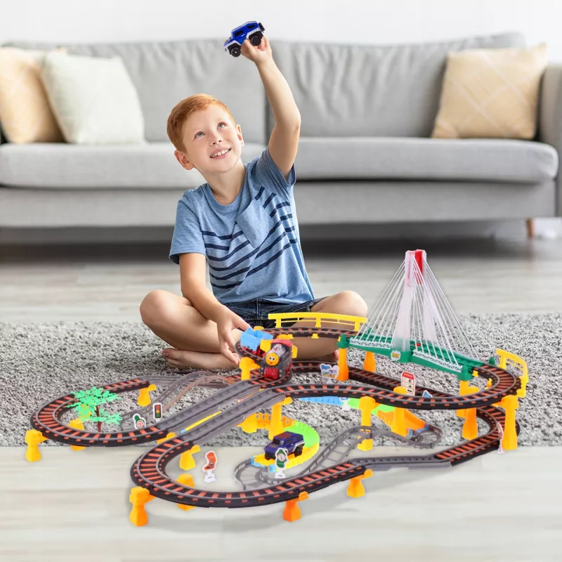 Zestaw kolejki elektrycznej z torami i świecącym mostem to doskonały pomysł na prezent pod choinkę, urodziny lub Dzień Dziecka.