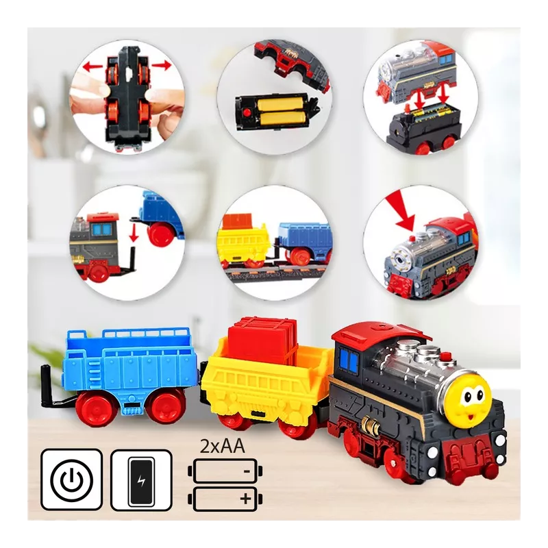 Lokomotywa zasilana bateriami porusza się po torze, ciągnie 3 odczepiane wagony i wydaje realistyczne dźwięki parowozu.