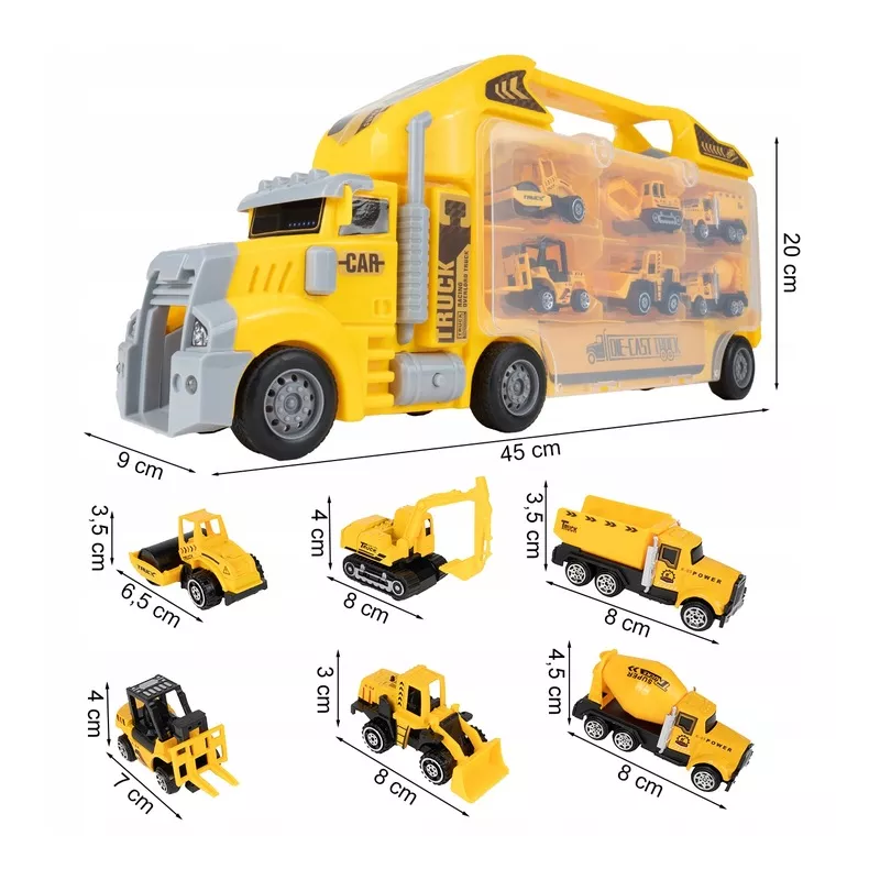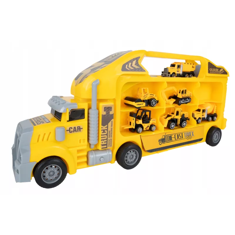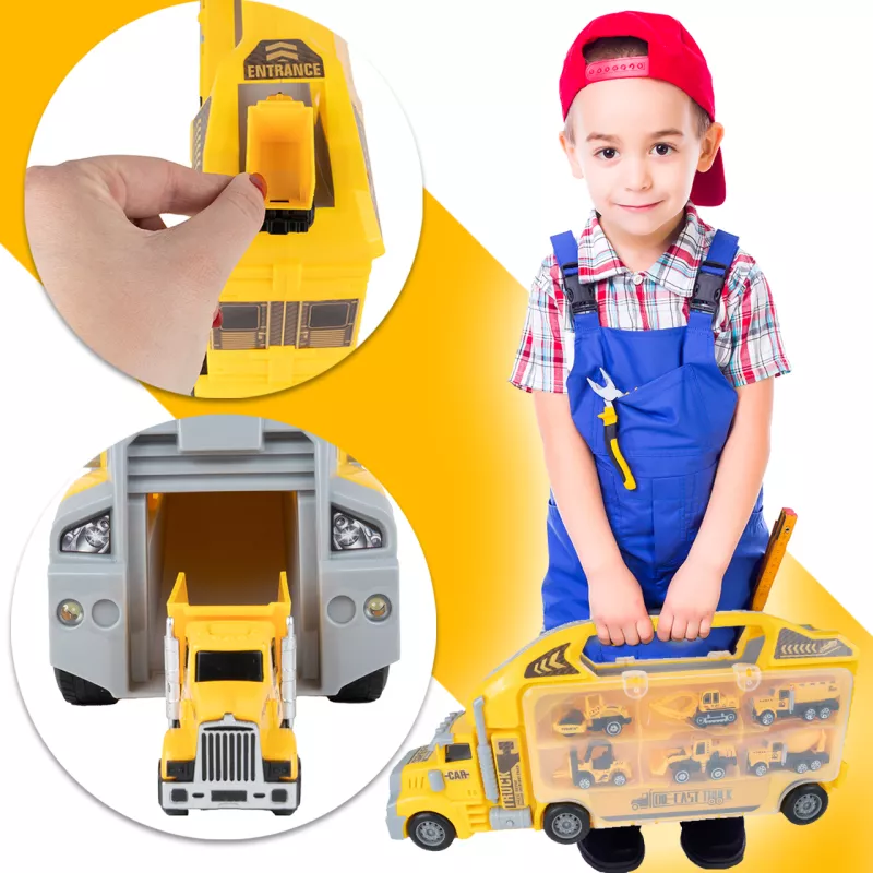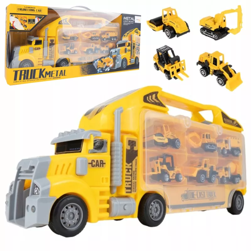 Ta duża ciężarówka walizka z 6 metalowymi autkami budowlanymi to prawdziwa gratka dla każdego małego fana motoryzacji i maszyn z placu budowy.