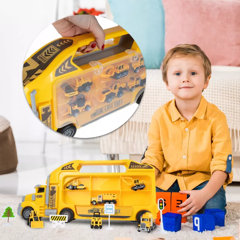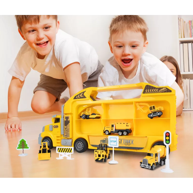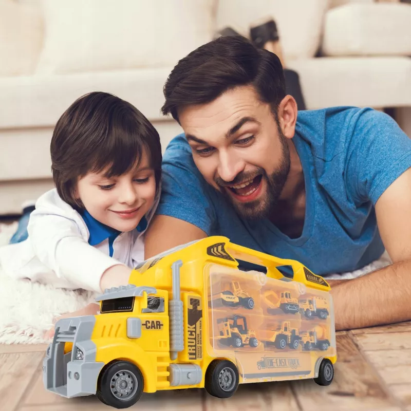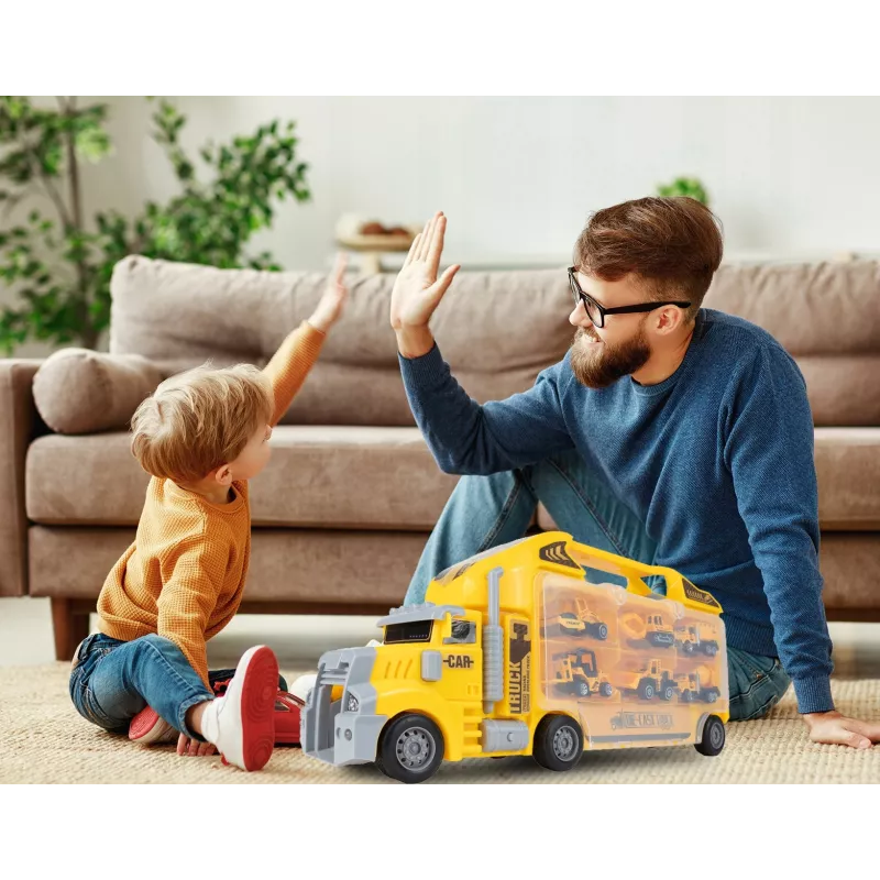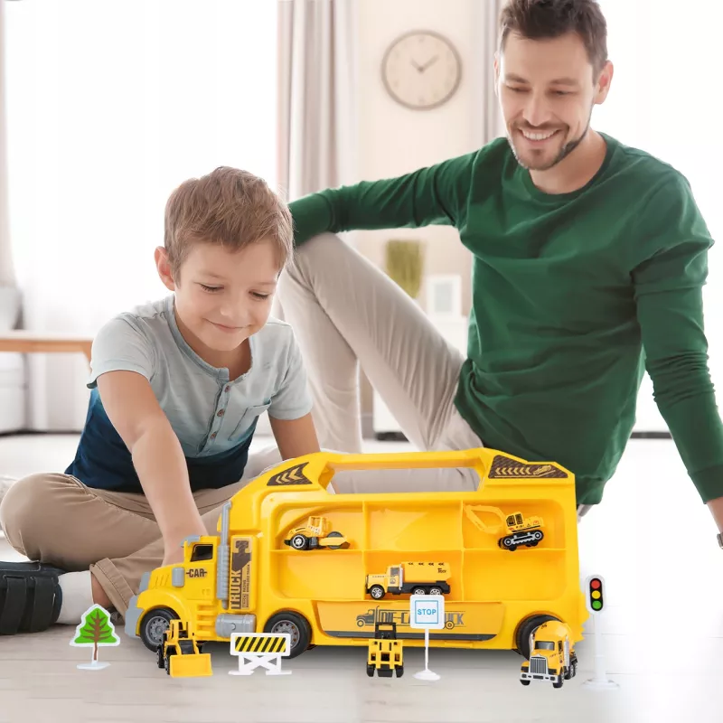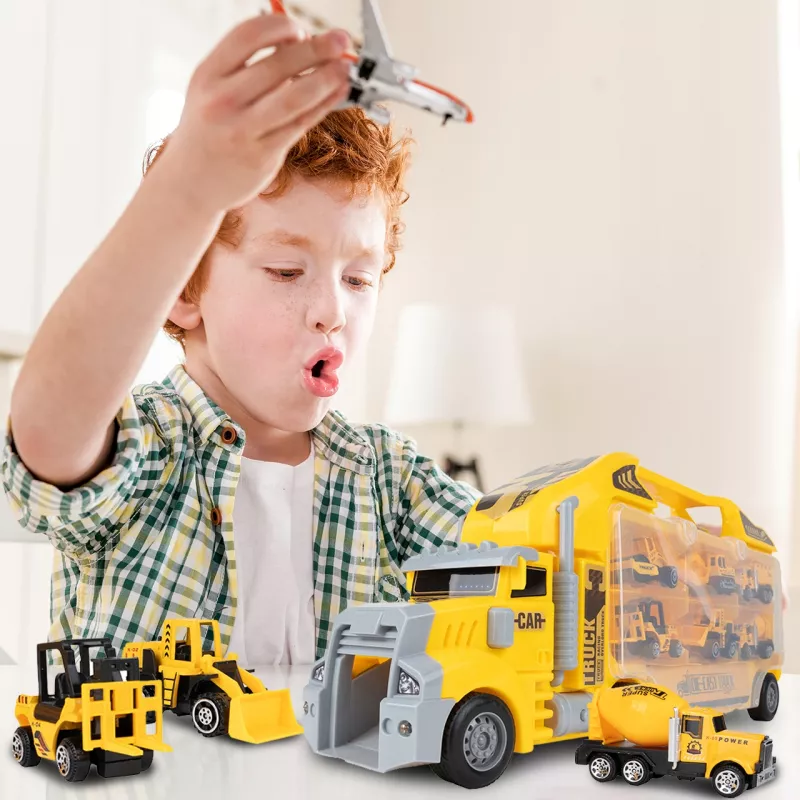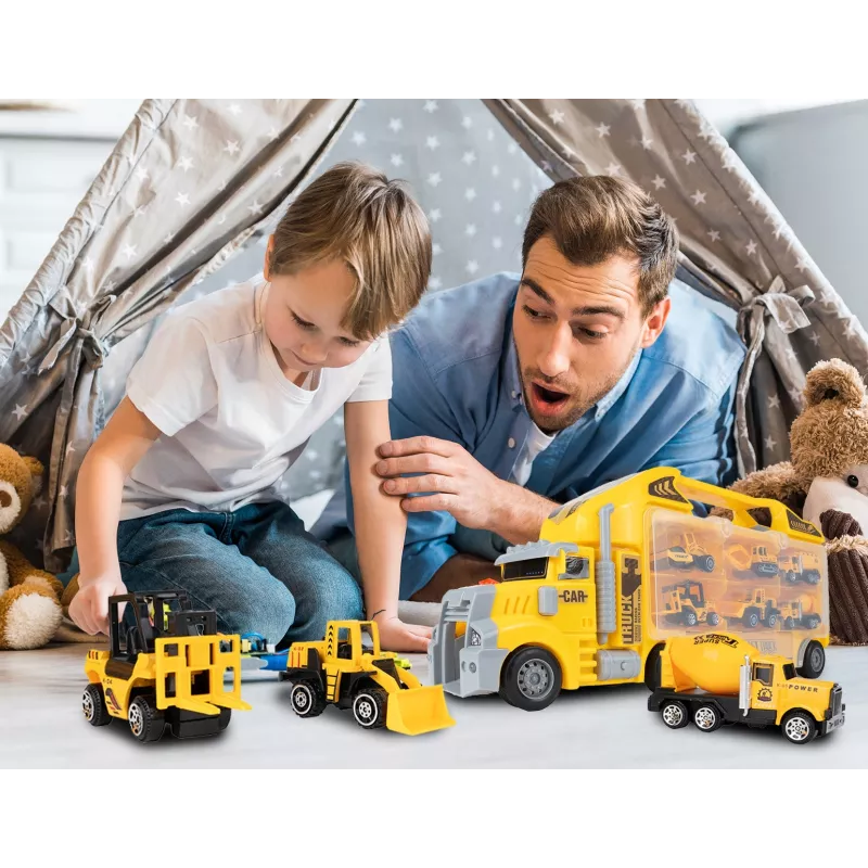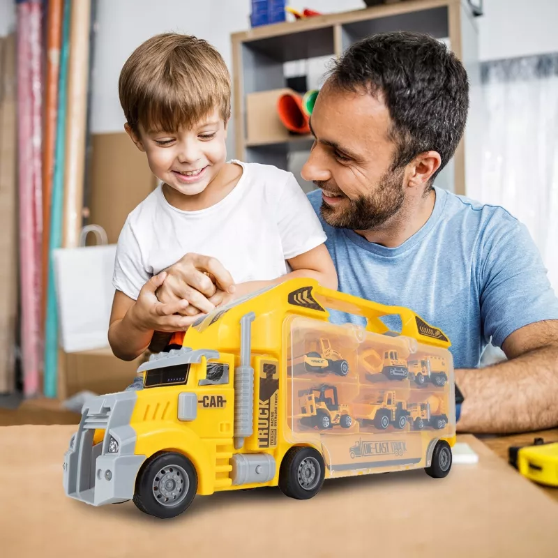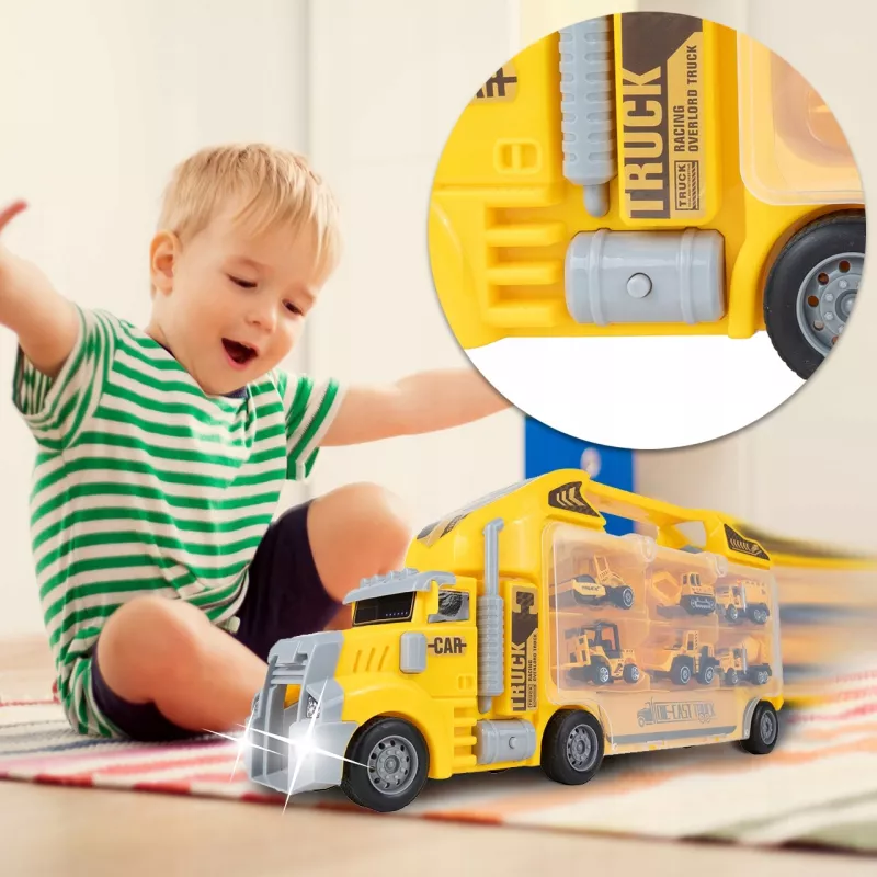 Dziecko może zjeżdżać mini-pojazdami prosto z ciężarówki, tworząc emocjonujące akcje na placu budowy.