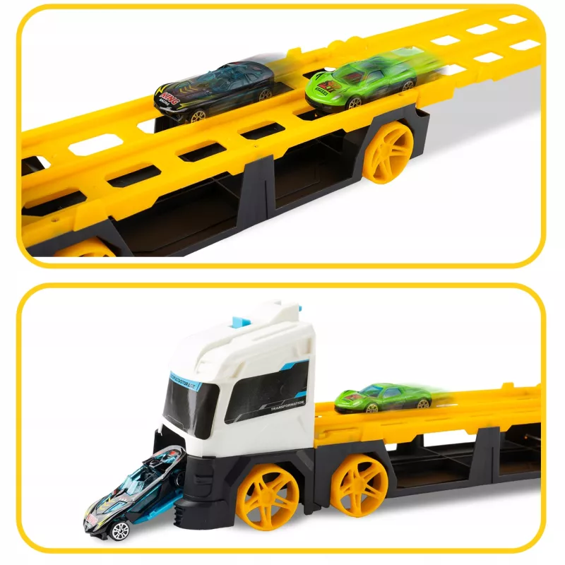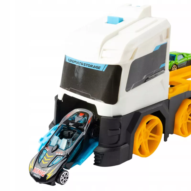 Zestaw pozwala dziecku samodzielnie przekształcać ciężarówkę w pełnoprawny tor wyścigowy z wyrzutnią. W trybie lawety maluch może przewozić swoje ulubione resoraki, a po rozłożeniu – rozpocząć ekscytującą rywalizację samochodową. To rozwija kreatywność, logiczne myślenie i zdolności manualne.