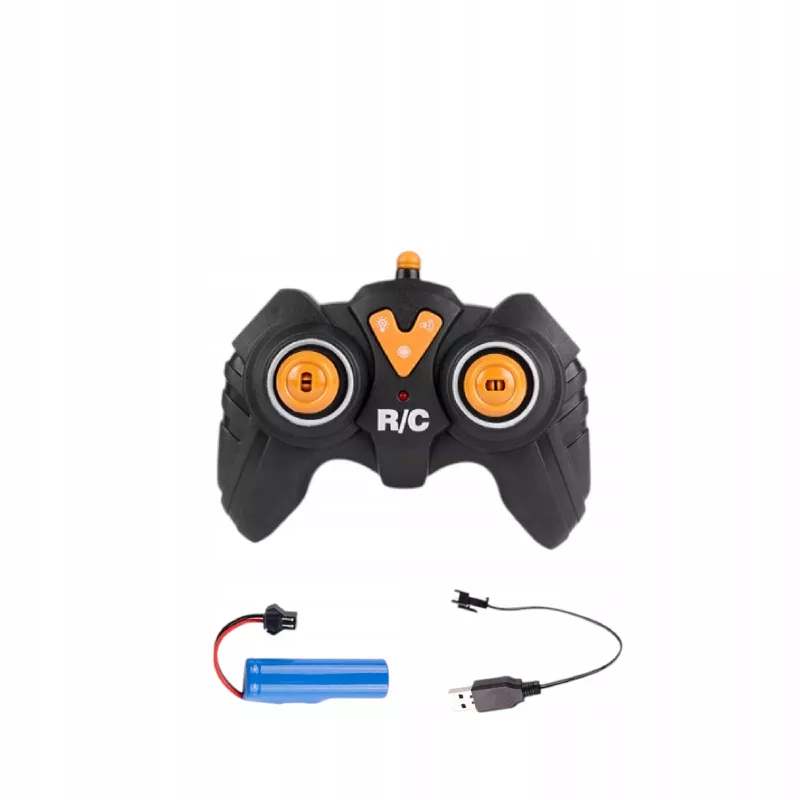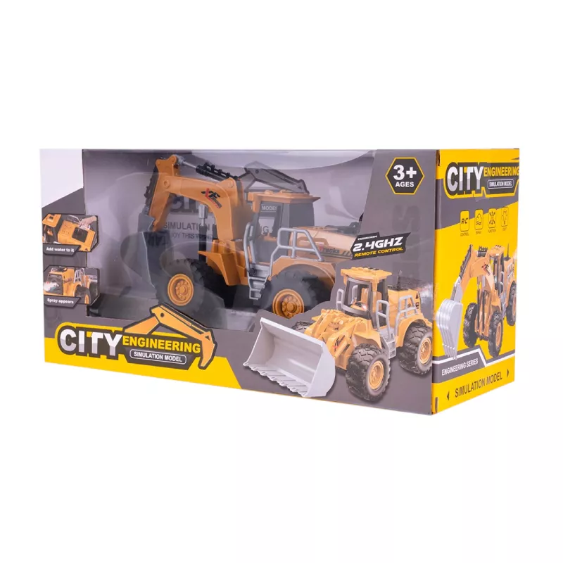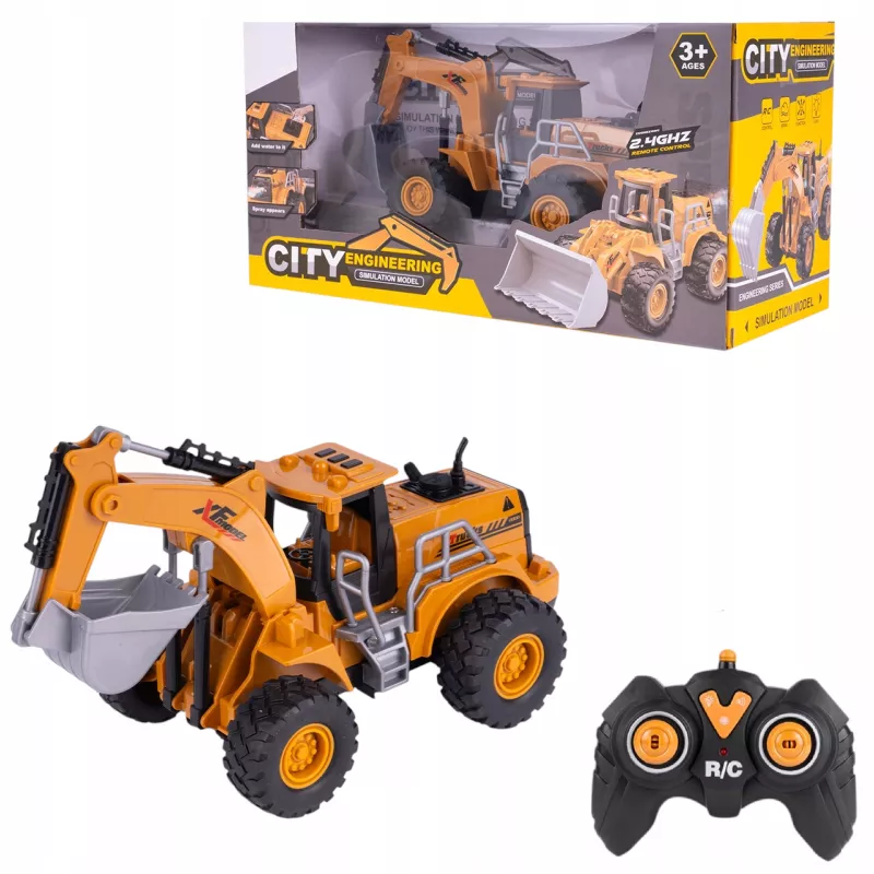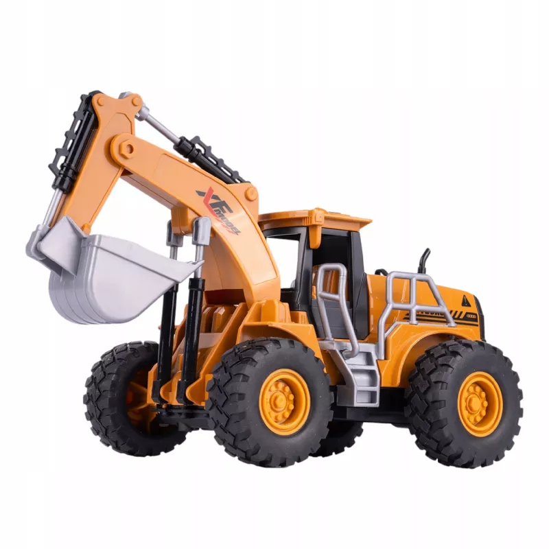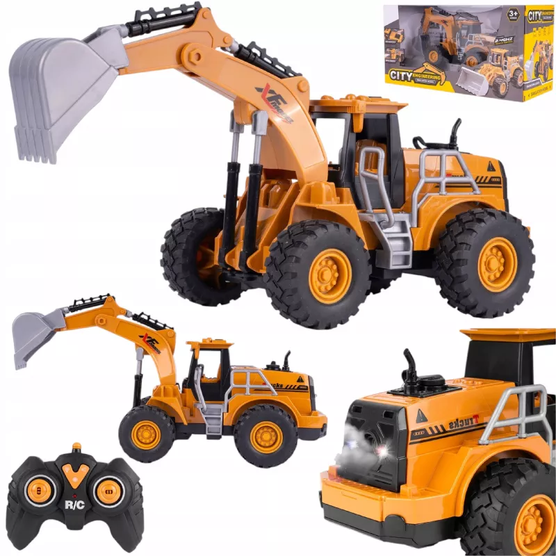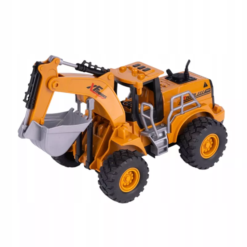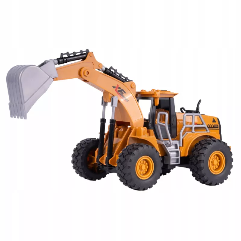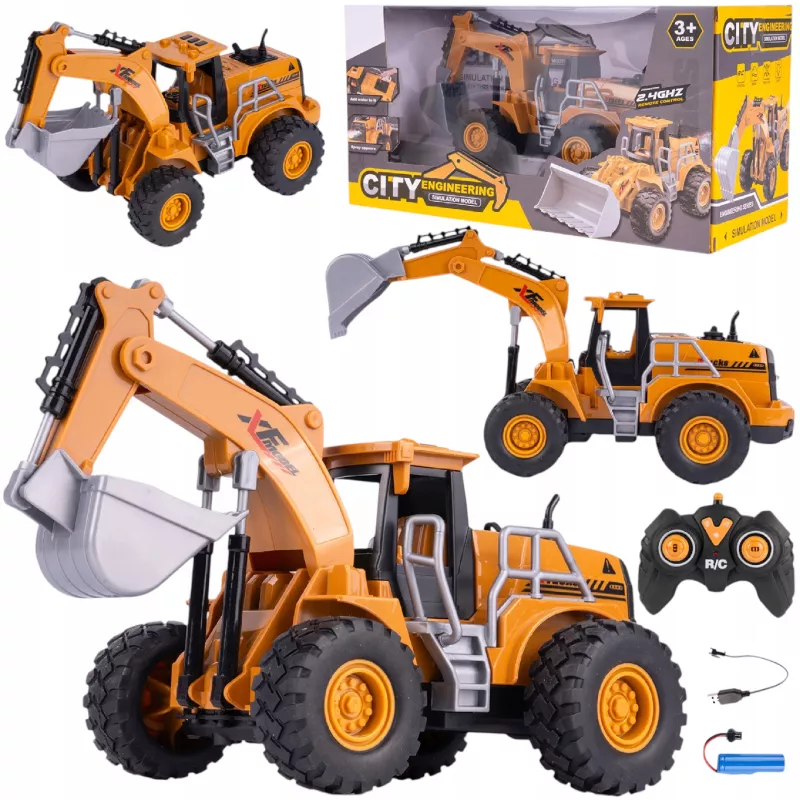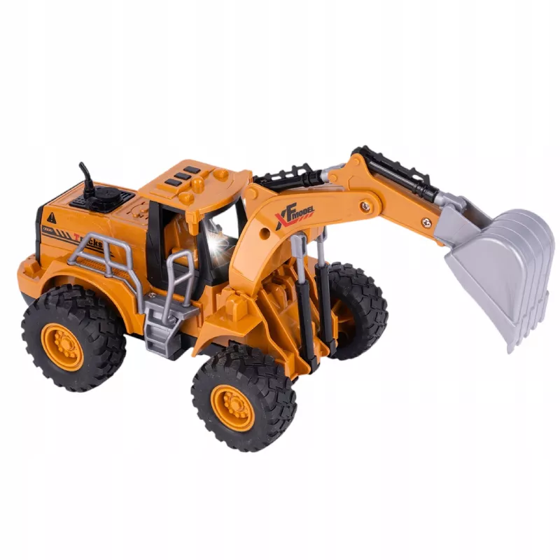 Wszystkie koła są gumowe i się kręcą, koparka jest zdalnie sterowana na pilota, jeździ do przodu, do tyłu, w prawo oraz w lewo.
