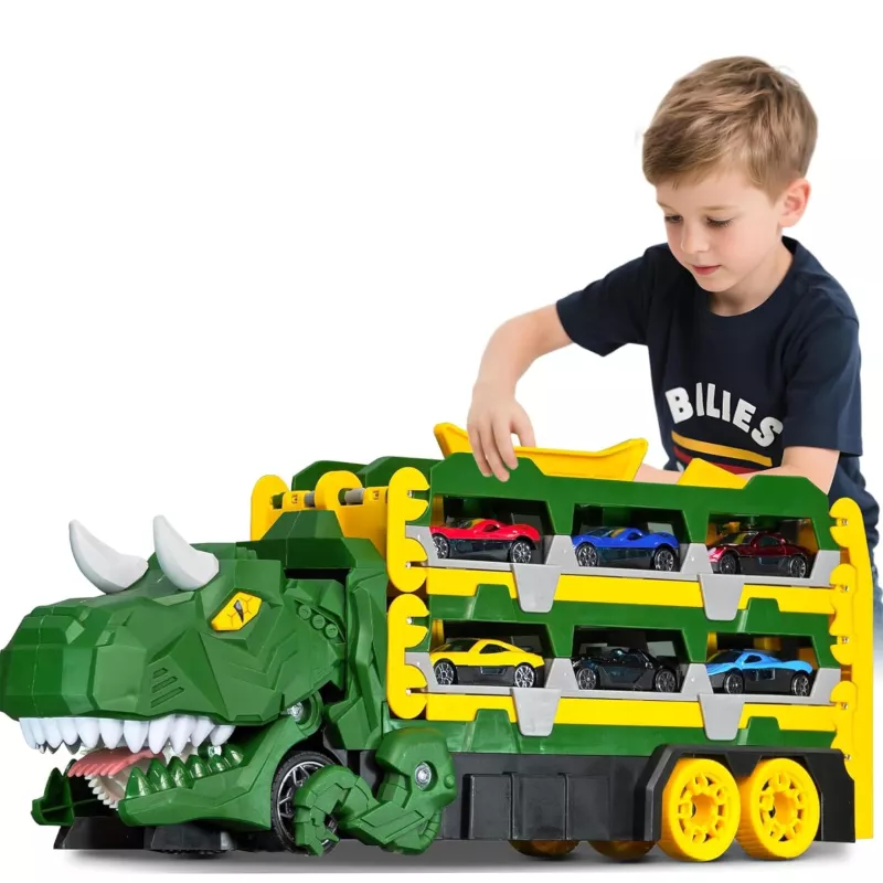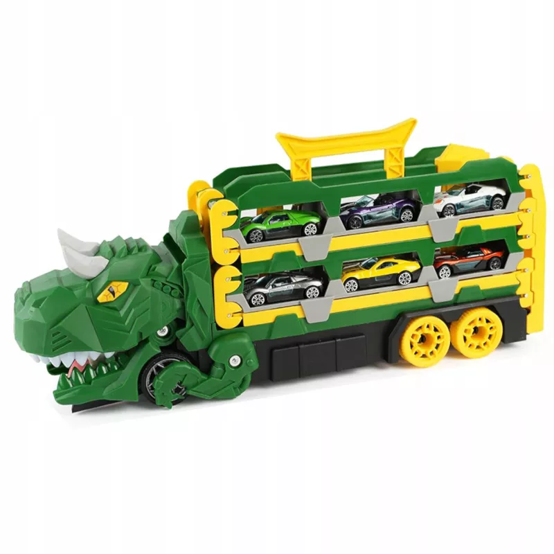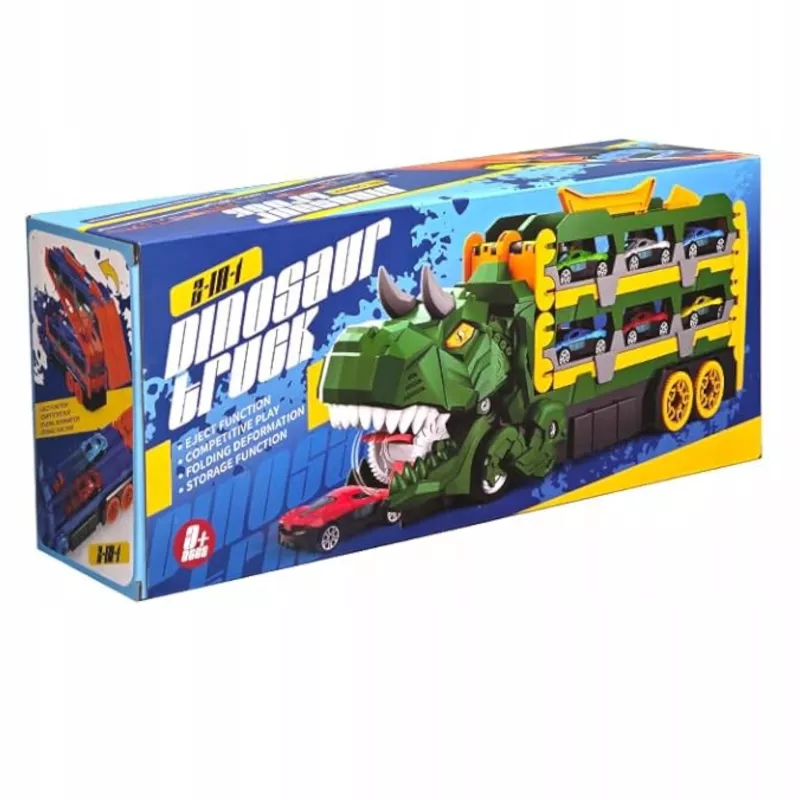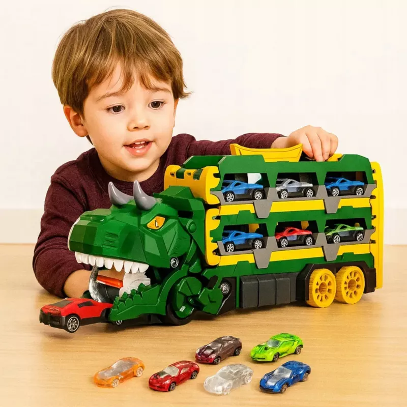 Transformujący samochodzik dinozaur to wyjątkowa zabawka 2w1, która łączy funkcję transportera autek oraz podwójnego toru wyścigowego. To idealny zestaw dla dzieci, które kochają dinozaury i samochody. Jedna zabawka – wiele możliwości kreatywnej zabawy.
