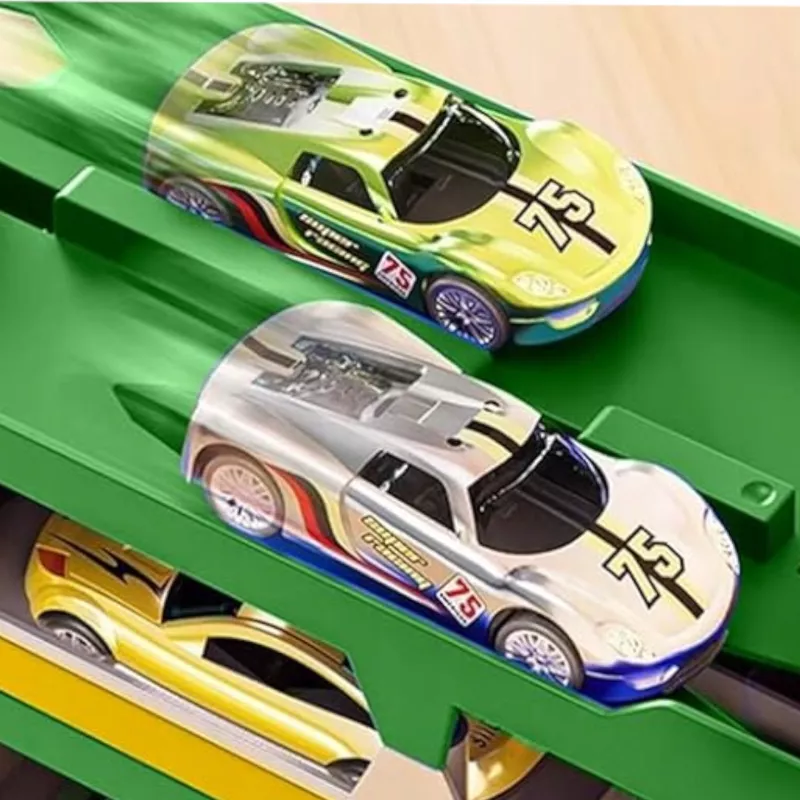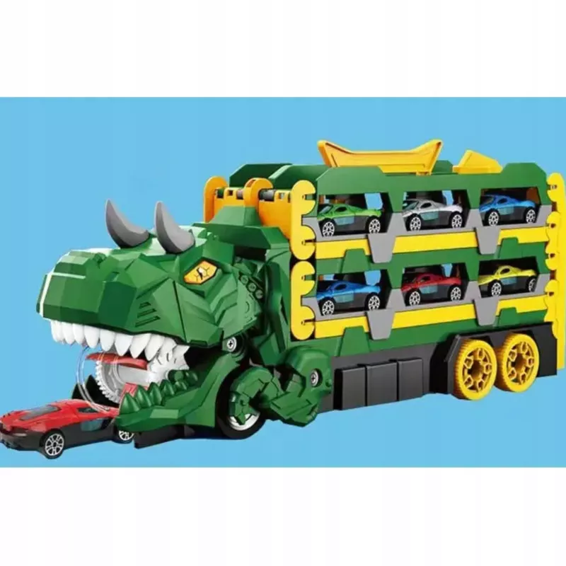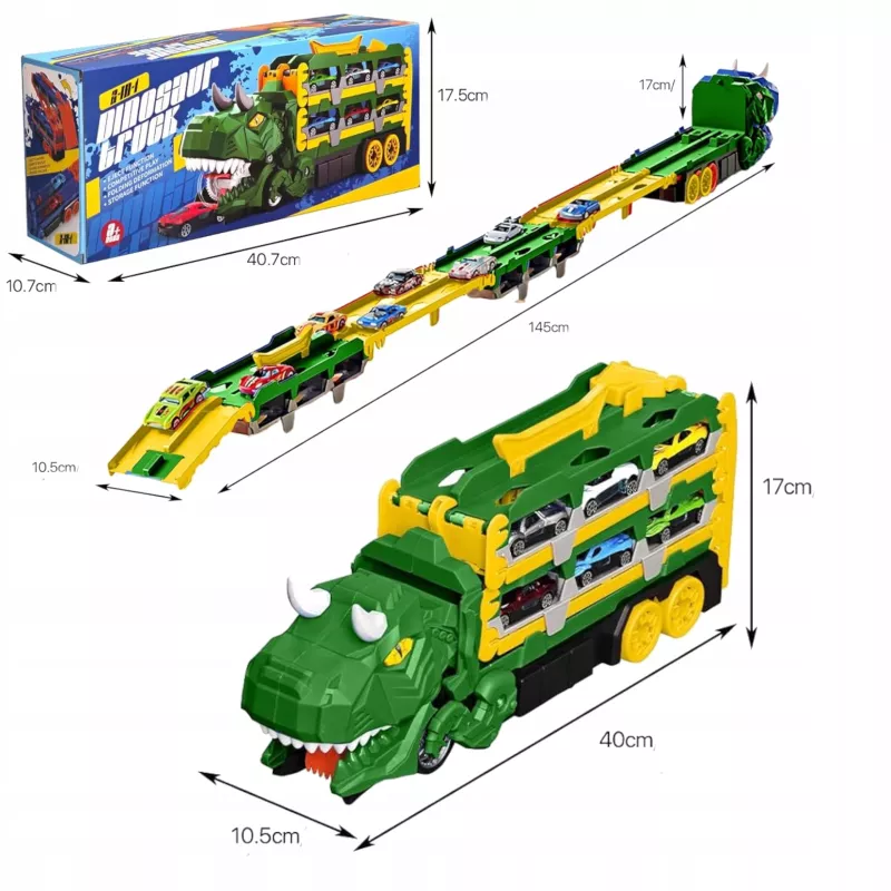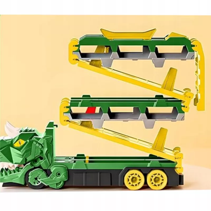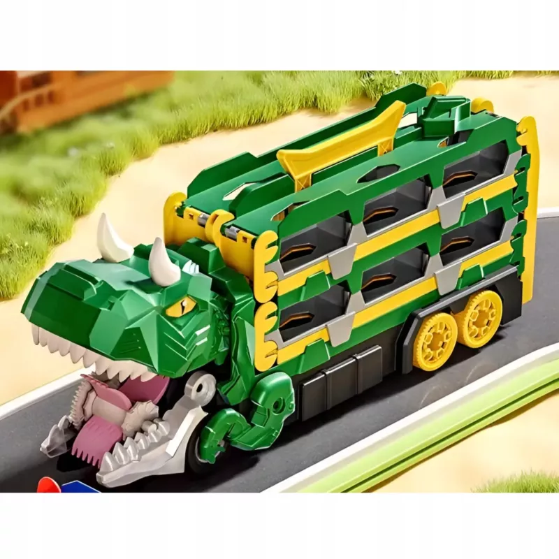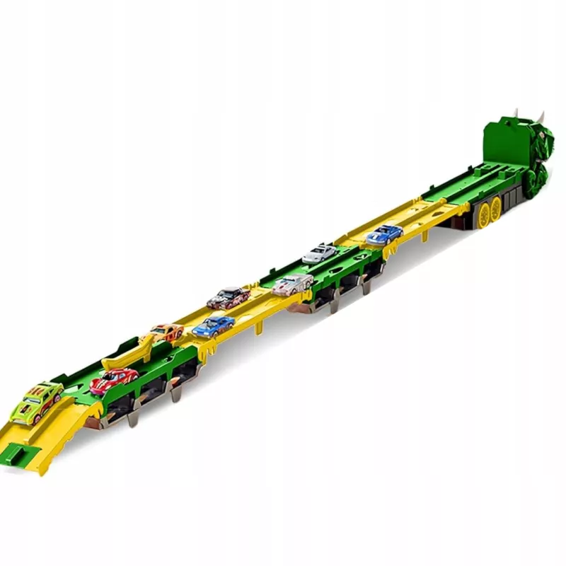 W trybie dinozaura zabawka zachwyca realistycznym wyglądem i interaktywną funkcją wciągania autek. Po rozłożeniu przekształca się w funkcjonalny tor wyścigowy.