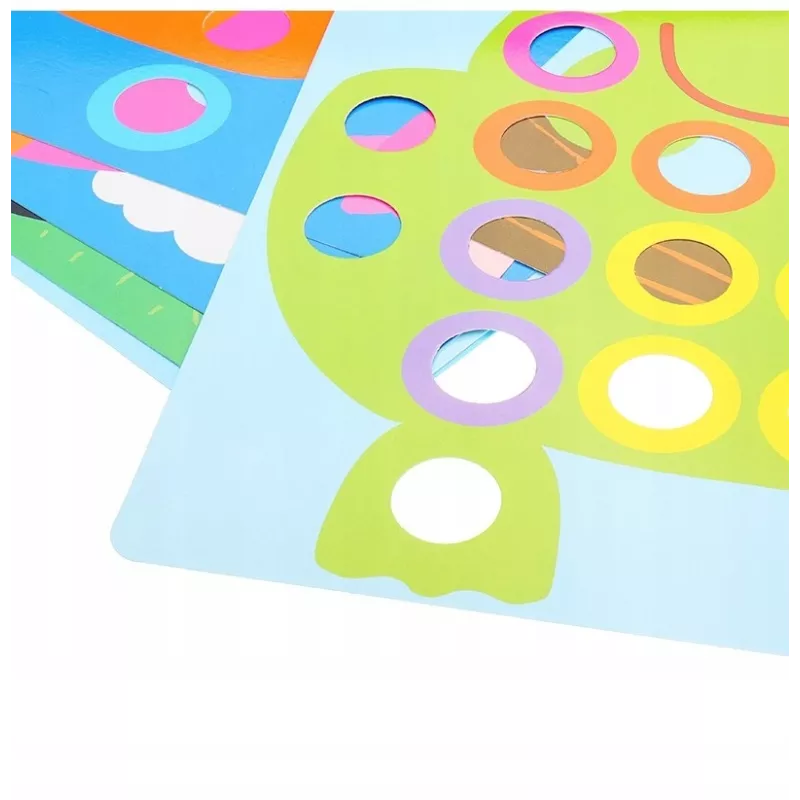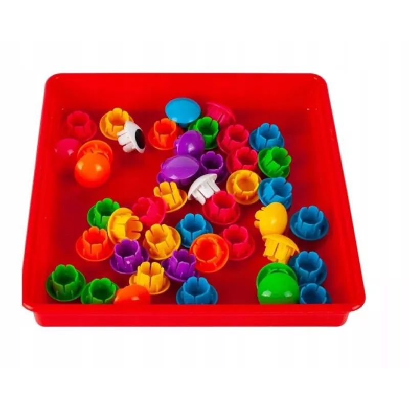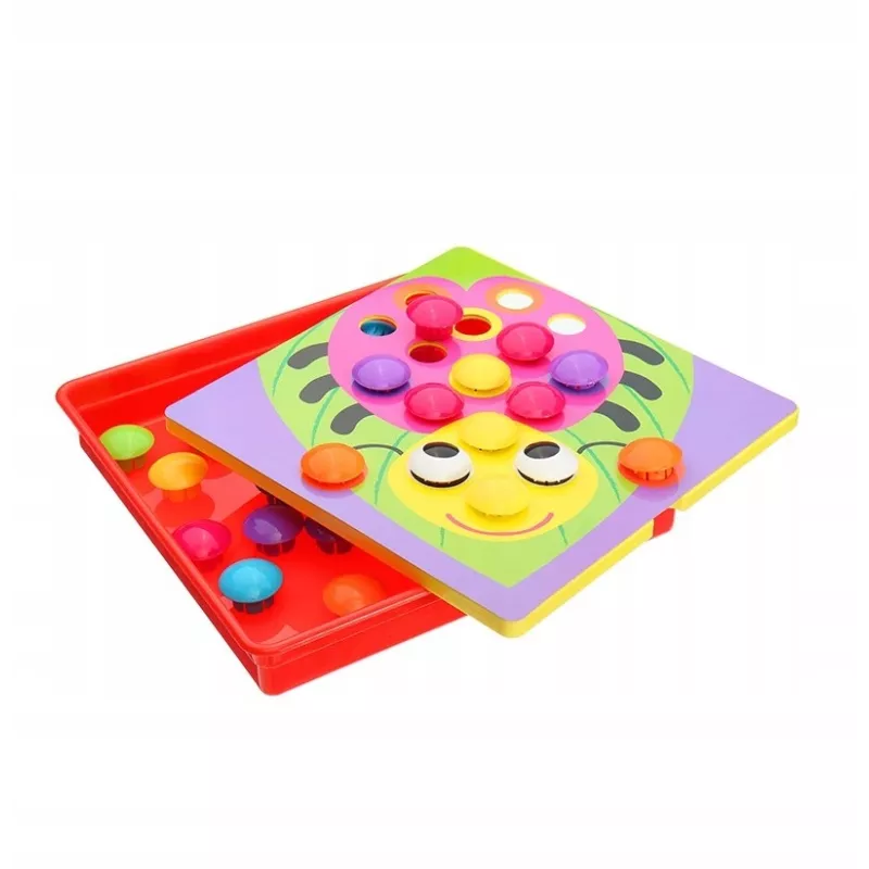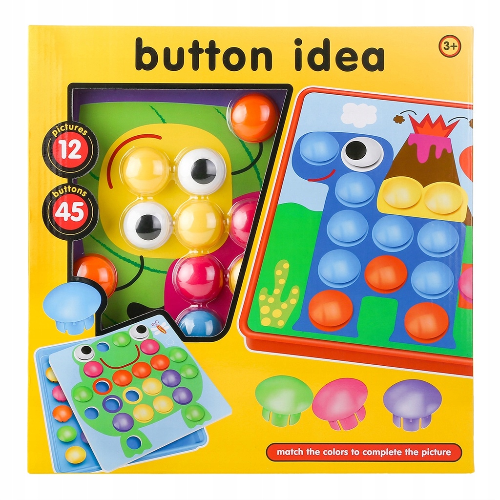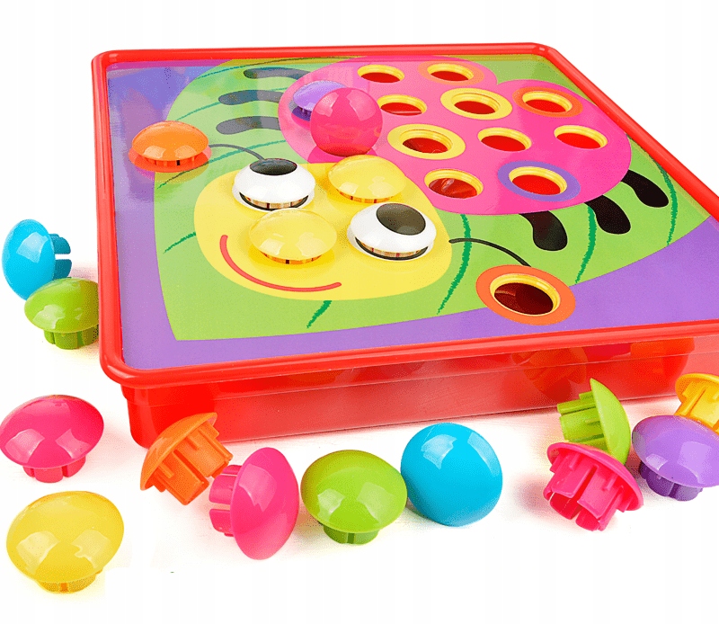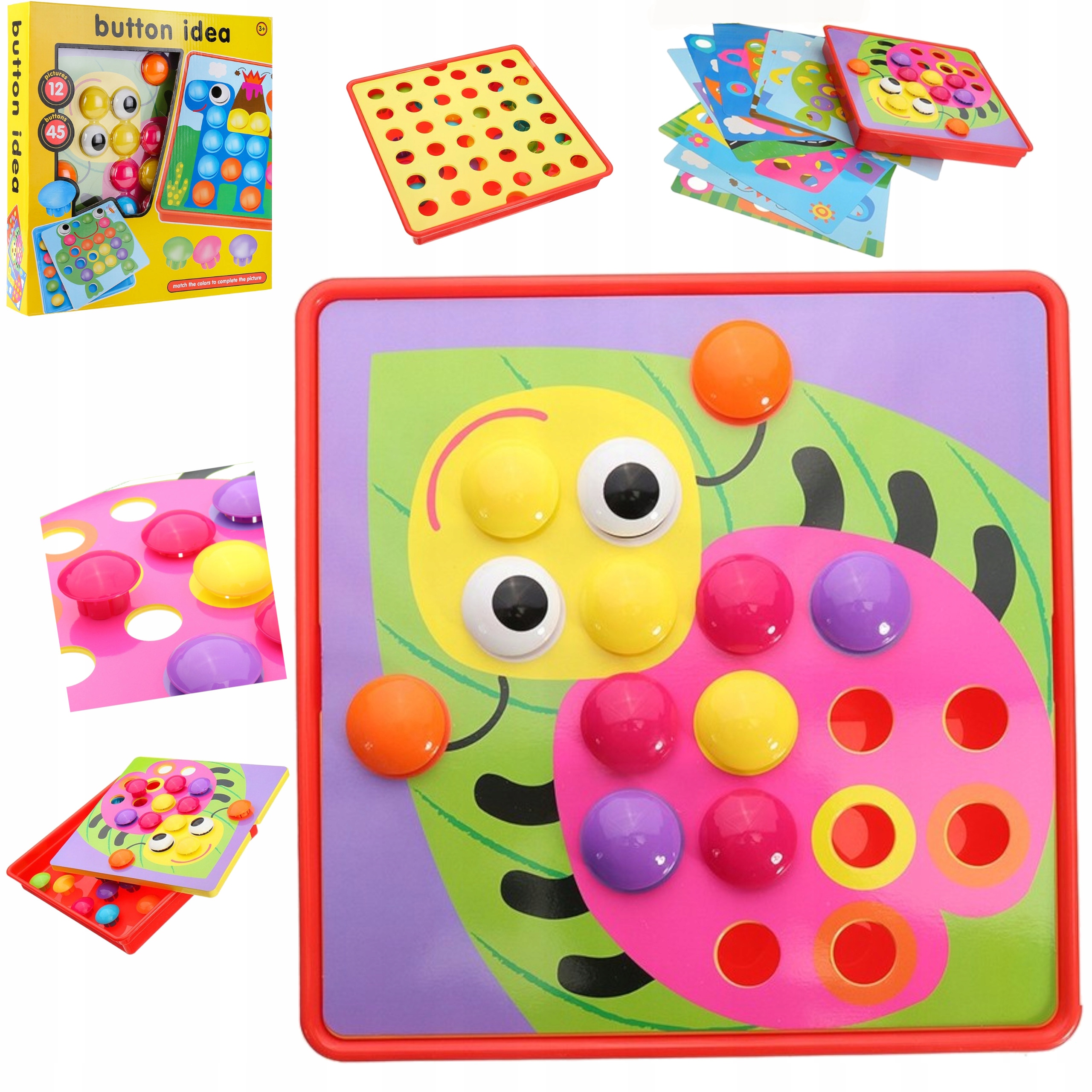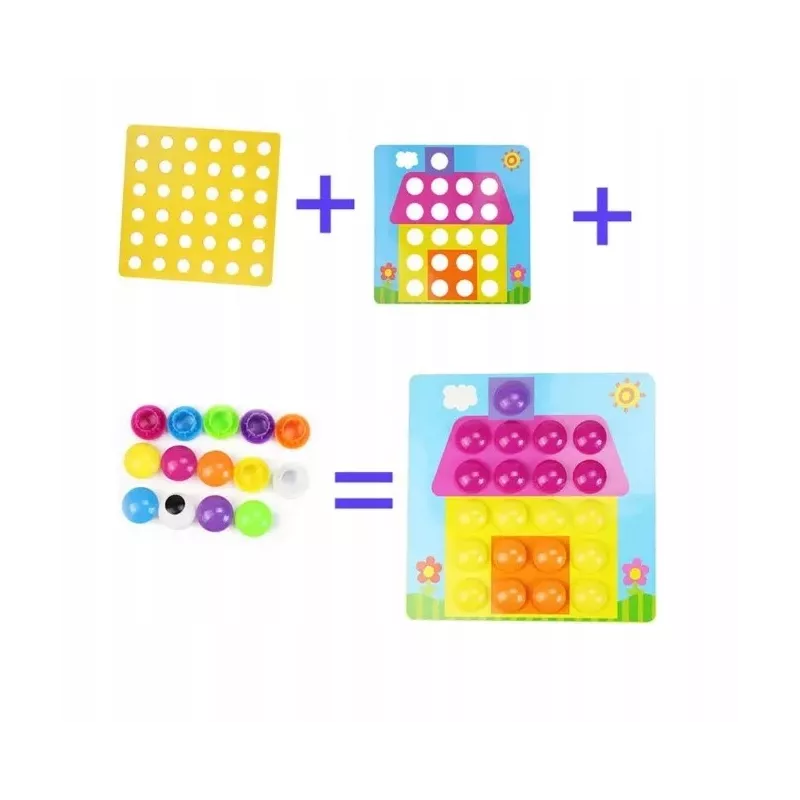 Dzięki kolorowym guzikom-grzybkom dzieci tworzą obrazki, ćwiczą skupienie, budują wyobraźnię i rozwijają sprawność dłoni, tak ważną w przygotowaniu do pisania.