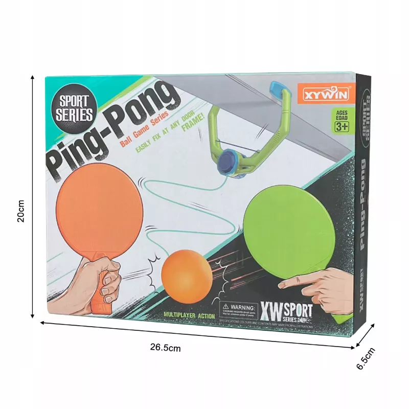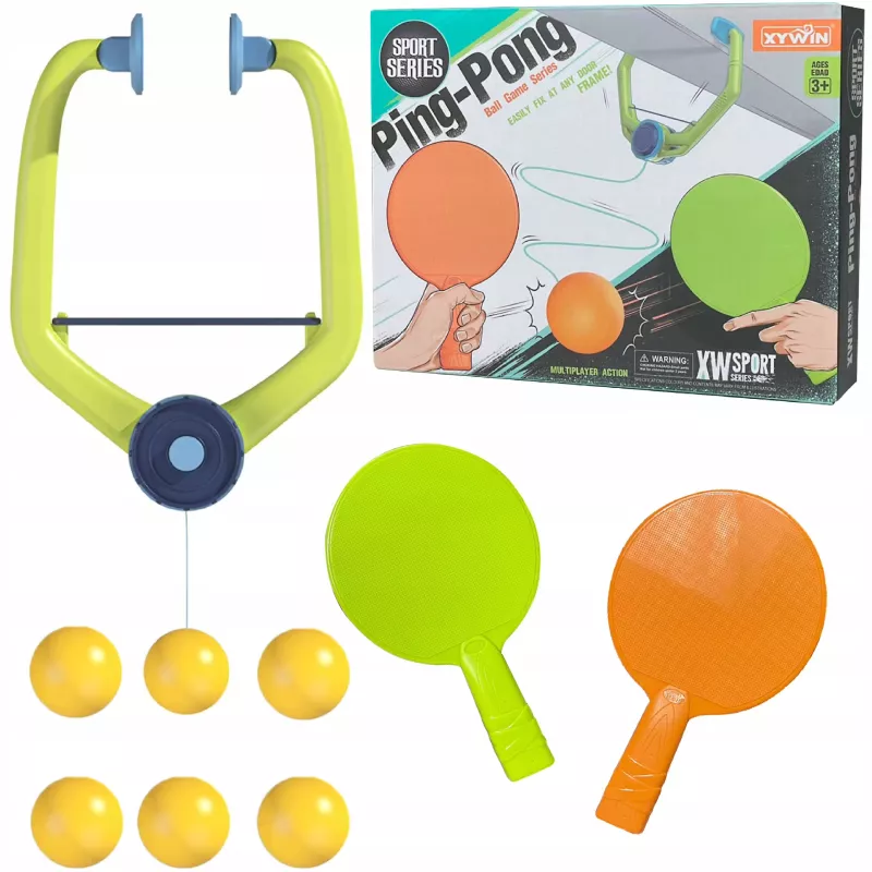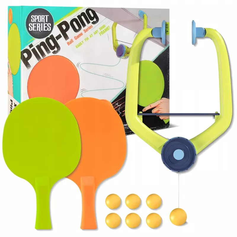 Zestaw jest kompletny i gotowy do gry. Zawiera dwie rakietki, sześć piłeczek oraz uchwyt podwieszany z piłeczką na sznurku.