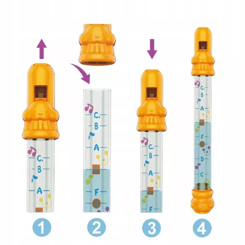 Wysokość dźwięku zależy od ilości wody w flecie. Im mniej wody, tym wyższy dźwięk. Dołączone karty z nutami pomagają w nauce grania prostych melodii.