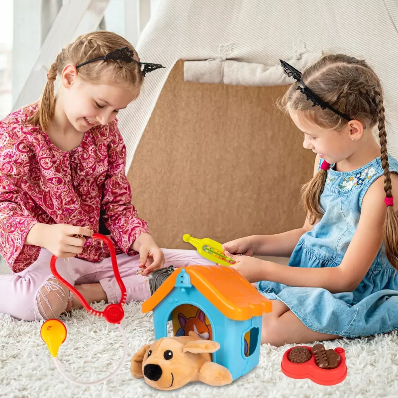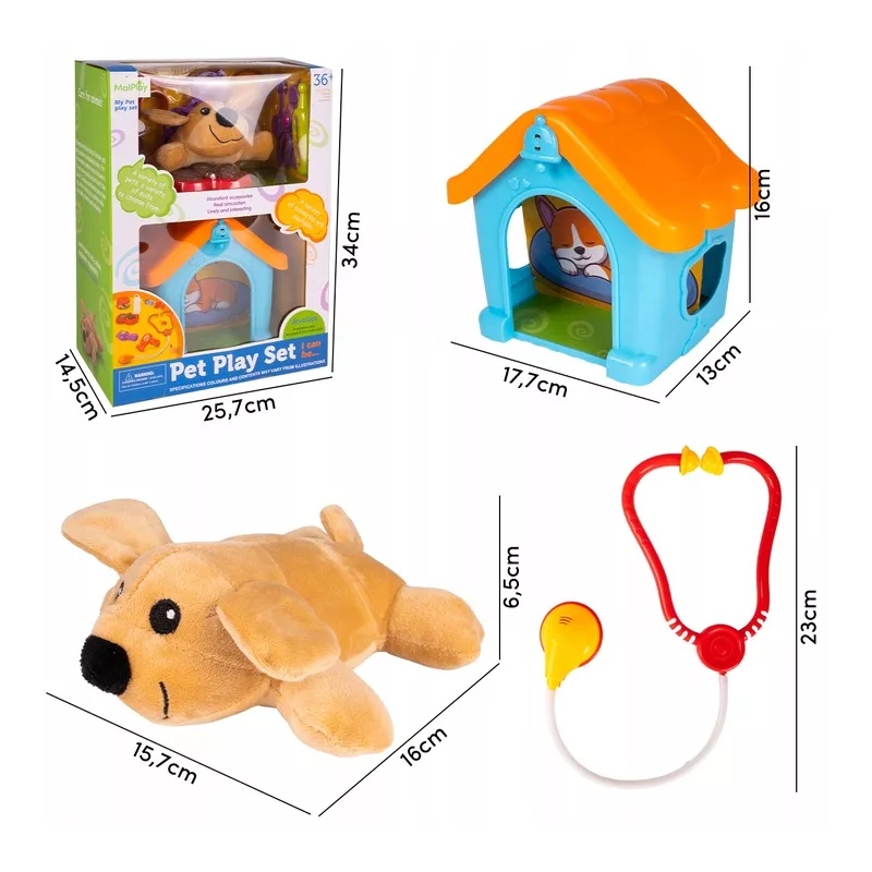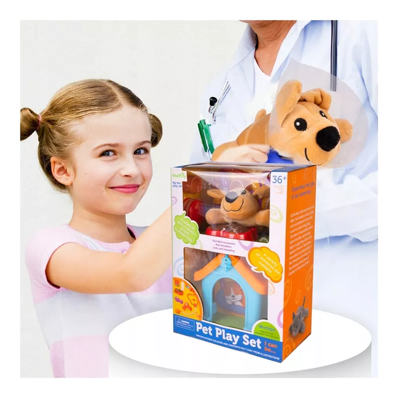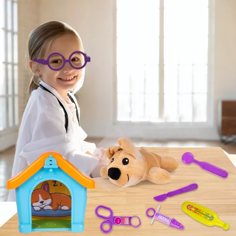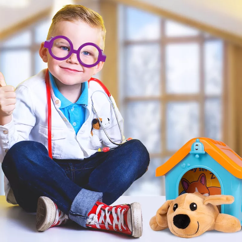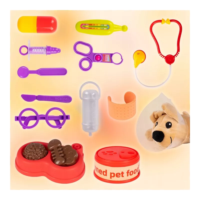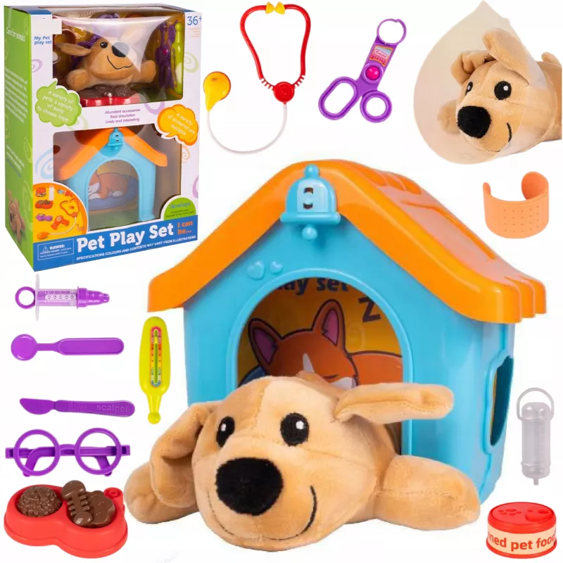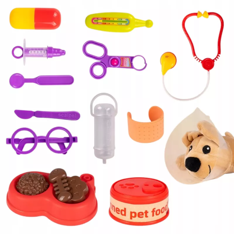 Dziecko może urządzić prawdziwy gabinet weterynaryjny w swoim pokoju, badać pieska stetoskopem, mierzyć temperaturę termometrem i podawać „leki” łyżeczką lub strzykawką. Kołnierz ochronny i opaska-opatrunek uczą, jak dbać o chore zwierzęta i tłumaczą, na czym polega proces leczenia.