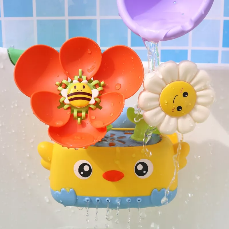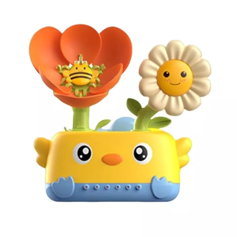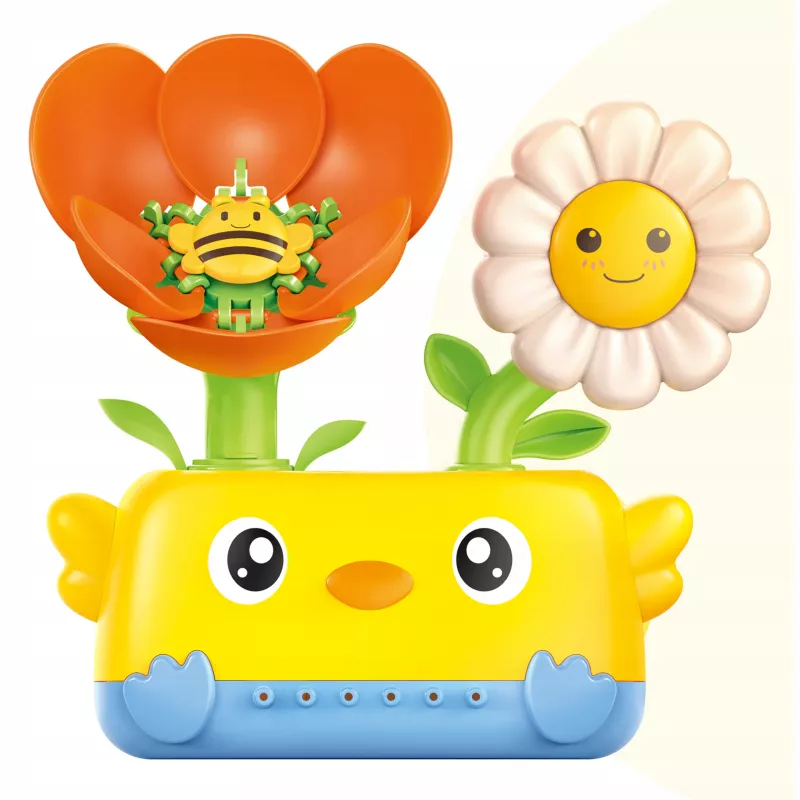 Wystarczy delikatnie nalać wodę od góry, aby uruchomić efekt – biały kwiatek zaczyna się obracać, a woda rozpyla się od dołu w formie strumieni. Dynamiczny ruch i przyjazny design natychmiast przyciągają uwagę malucha.