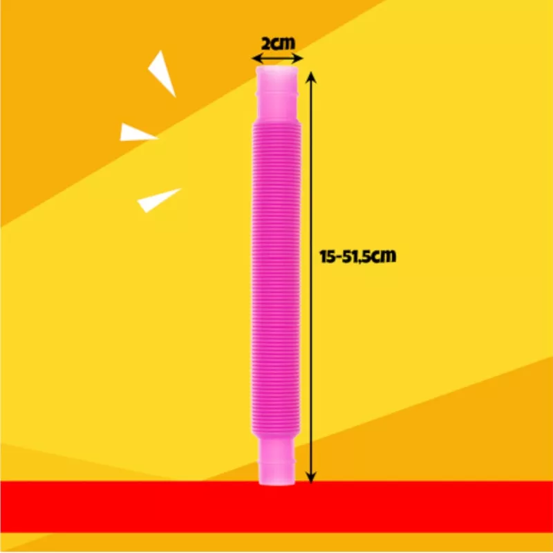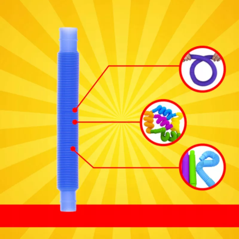 Każdą rurkę można wyginać, rozciągać i łączyć w dowolne kształty – od długich węży po fantazyjne figury. Przyjemne dźwięki podczas zabawy pomagają w redukcji stresu, a system zatrzaskowy umożliwia bezpieczne łączenie elementów w stabilne konstrukcje.