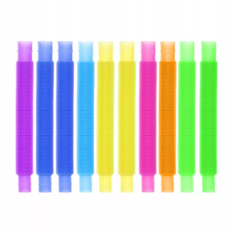 Rurki / tuby sensoryczne POP to zestaw 10 elastycznych, kolorowych rurek, które rozwijają motorykę małą, wyobraźnię przestrzenną i kreatywność u dzieci oraz zapewniają relaks i wyciszenie dorosłym.
