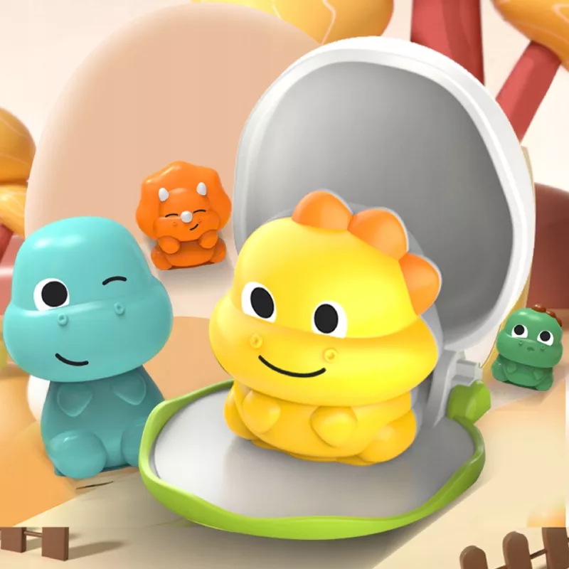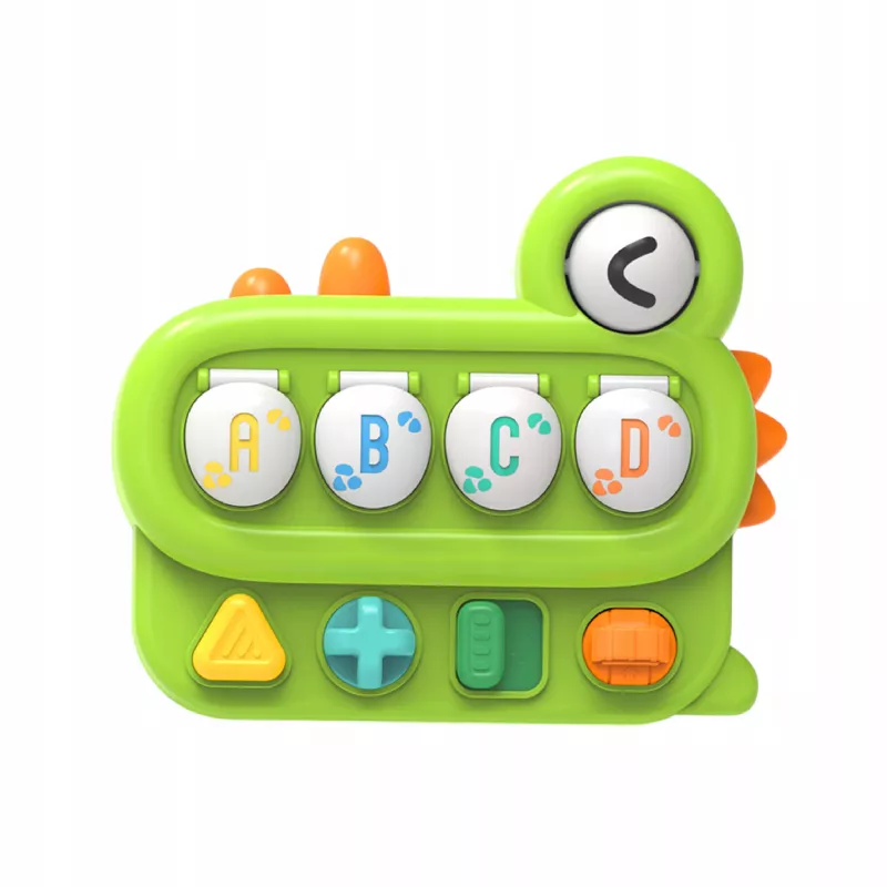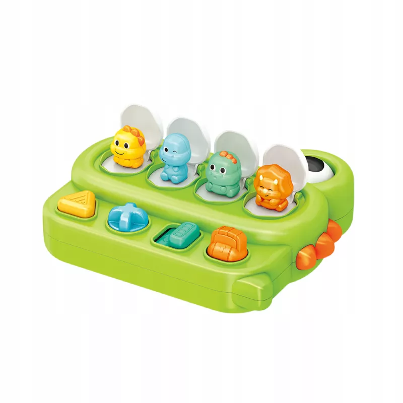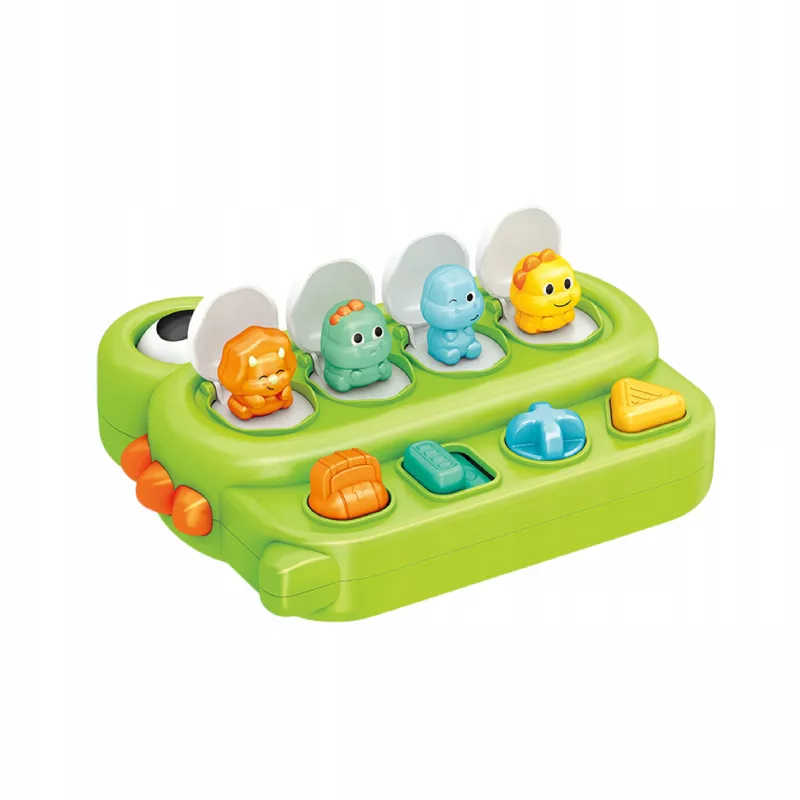Ta urocza zabawka w kształcie głowy dinozaura została stworzona z myślą o najmłodszych. Dzieci mogą naciskać, przekręcać lub przesuwać kolorowe przyciski, a wtedy z ukrycia wyskakują uśmiechnięte dinozaury, co na pewno sprawi im mnóstwo radości.