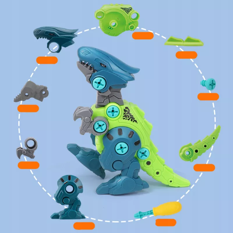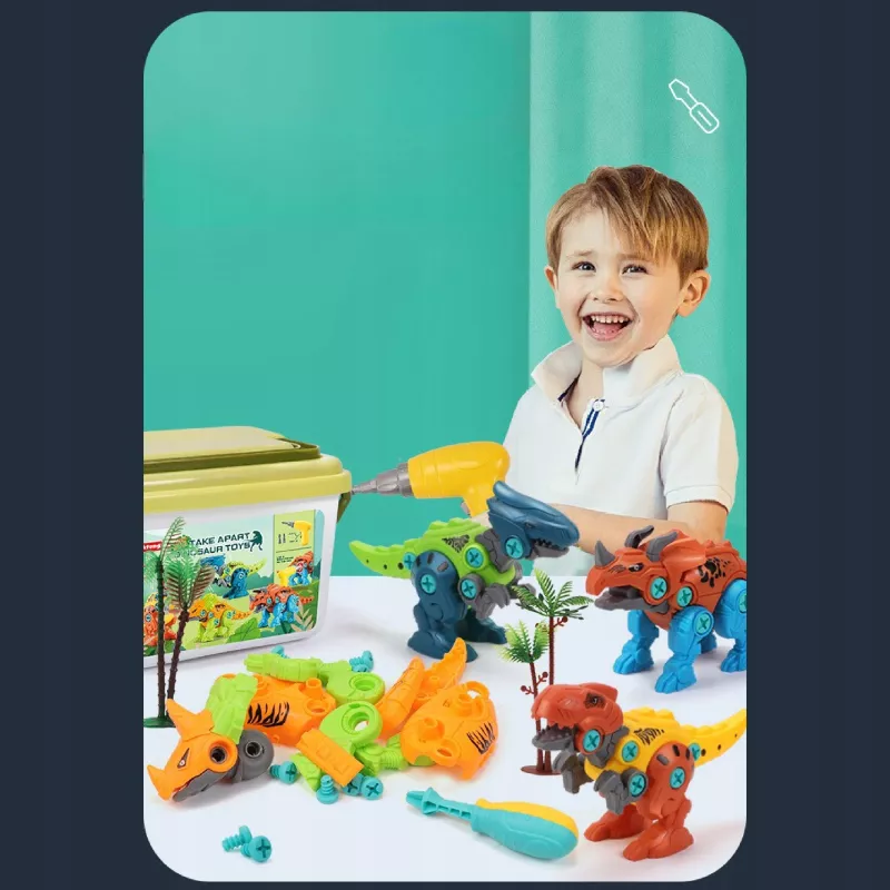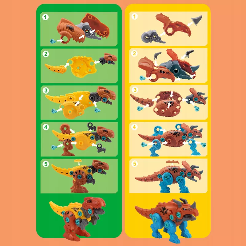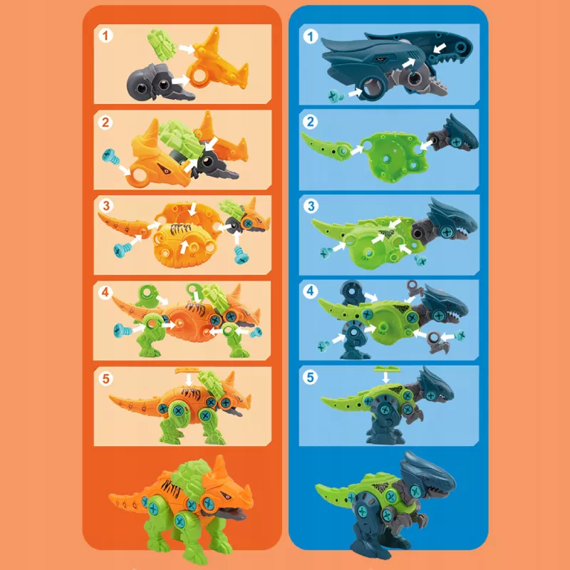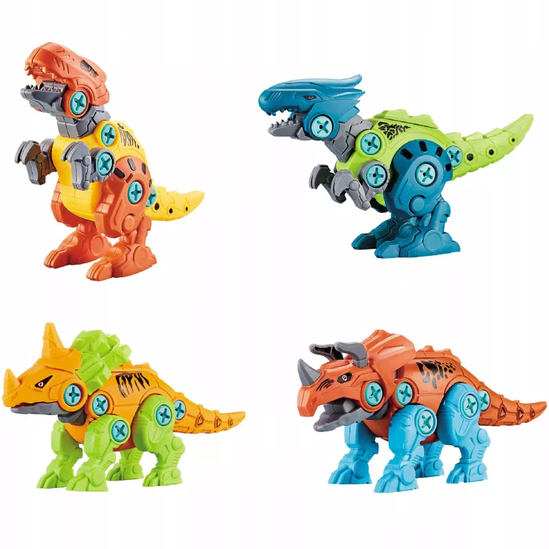 Zestaw konstrukcyjny „Dinozaury” to edukacyjna i kreatywna zabawka, która pozwala Twojemu dziecku na samodzielne budowanie realistycznych dinozaurów. W skład zestawu wchodzą aż 4 prehistoryczne stwory: Centrozaur, Triceratops, Velociraptor i Tyranozaurus Rex, każdy z ruchomymi kończynami, otwierającą się paszczą oraz podnoszonym ogonem. To doskonały sposób na rozwijanie manualnych zdolności dziecka, kreatywności i wyobraźni przestrzennej.