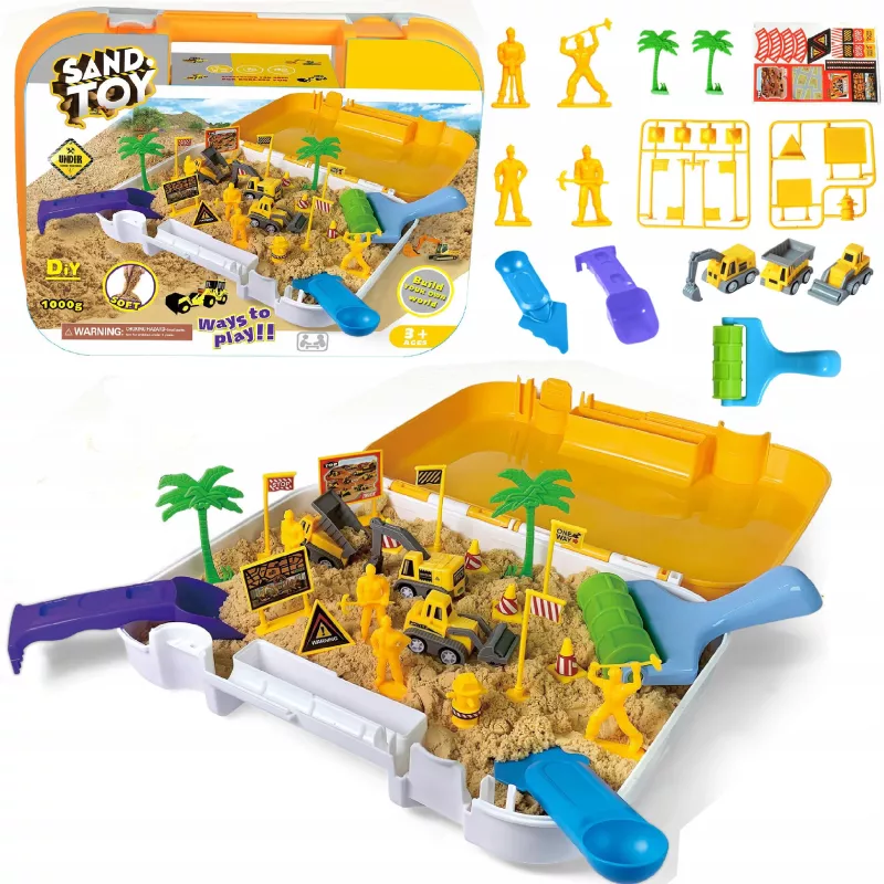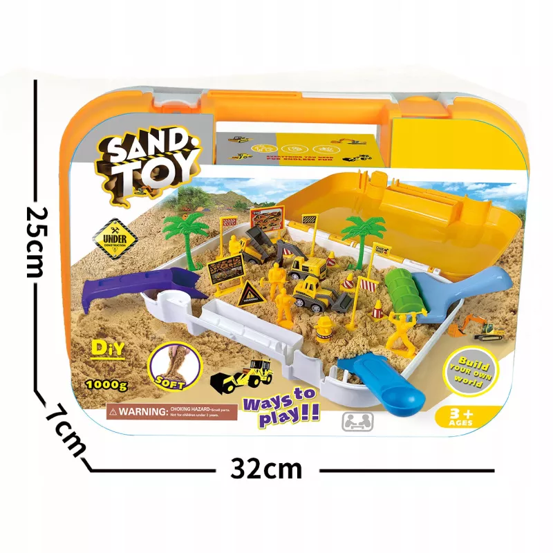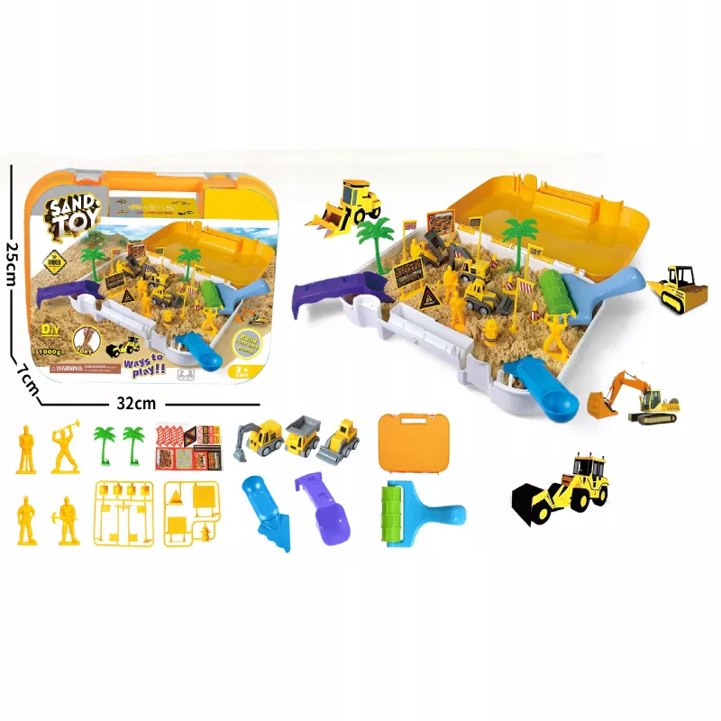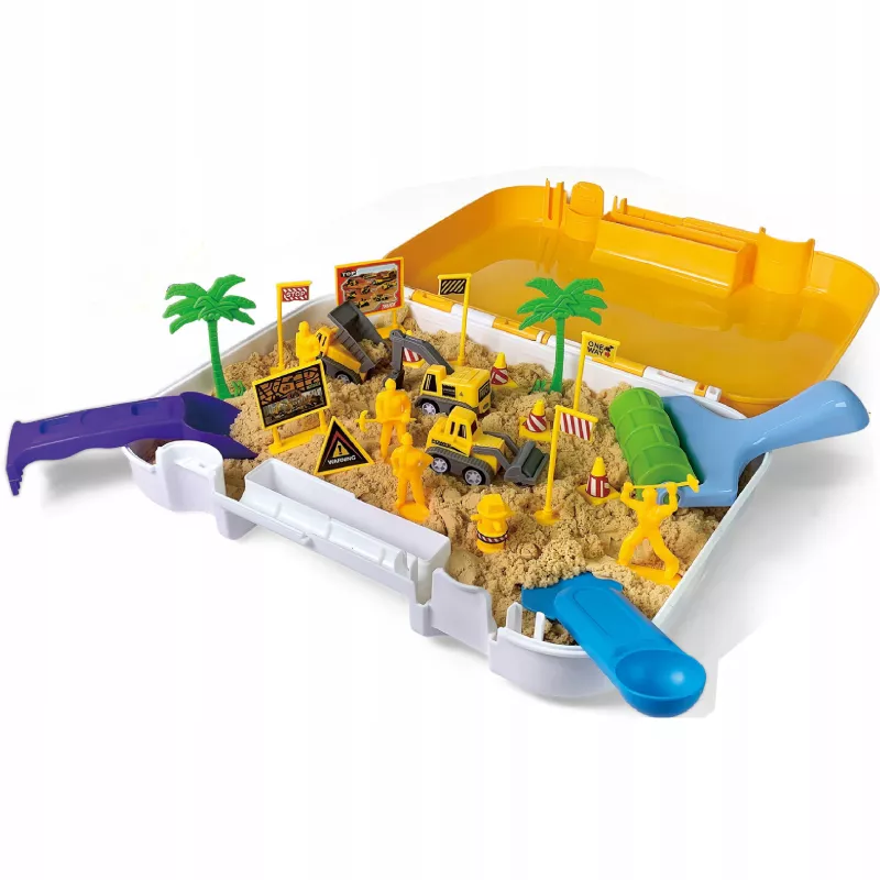 Zestaw został zaprojektowany tak, aby zapewnić maksymalną funkcjonalność przy minimalnym bałaganie – piasek nie przykleja się do rąk ani powierzchni, a praktyczna walizka pełni również funkcję tacki do zabawy.