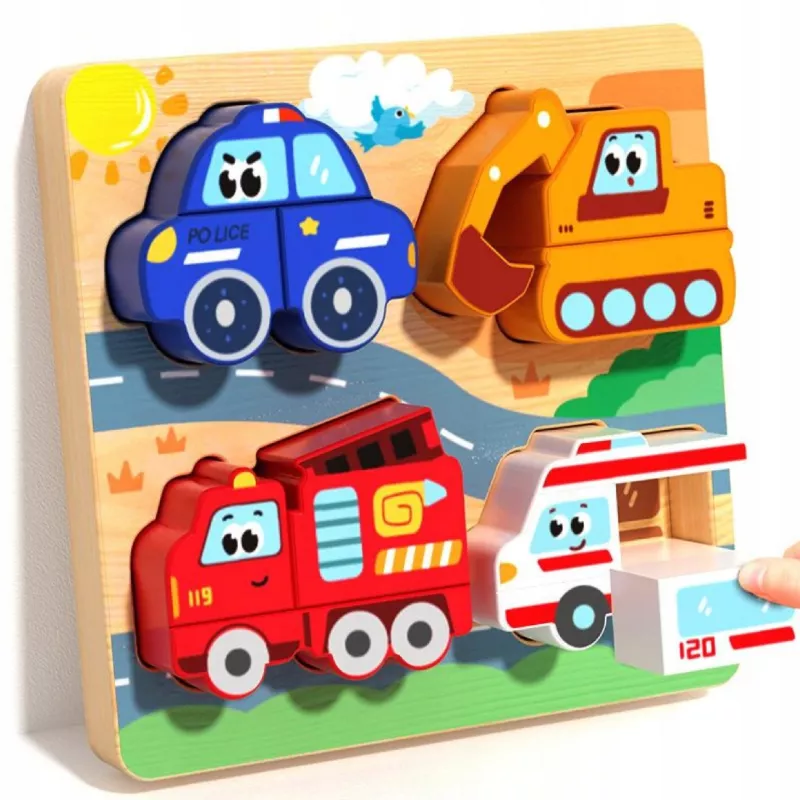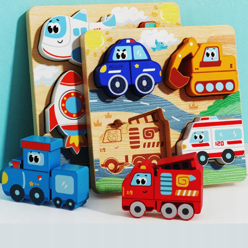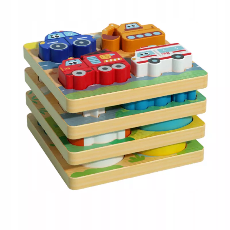 Drewniana układanka z pojazdami to zabawka, która nie nudzi się po jednym dniu i rośnie razem z dzieckiem.
