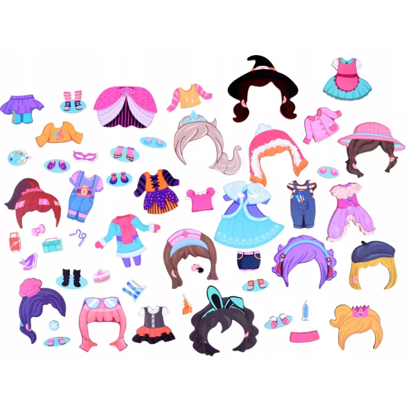 • 51 kolorowych magnesów: ubrania, fryzury, dodatki, nakrycia głowy