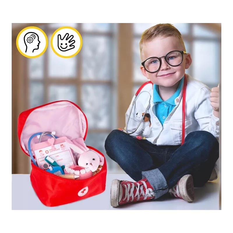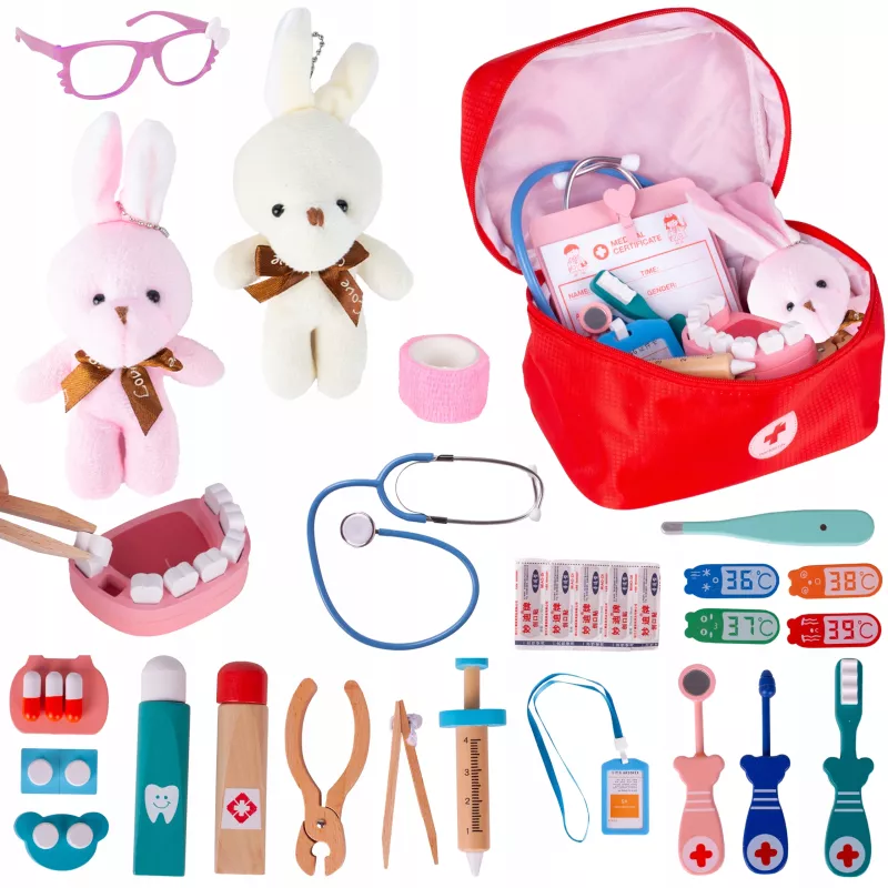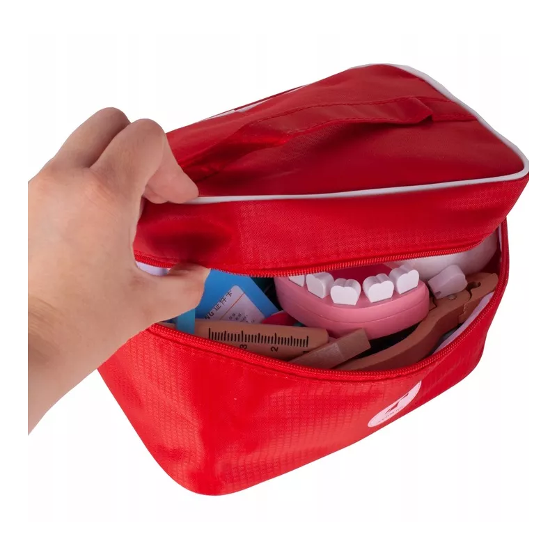 Drewniany zestaw lekarza i dentysty w walizce z króliczkiem – oswaja wizyty, uczy opieki, daje mnóstwo scenek do zabawy. Dziecko bada, mierzy temperaturę, robi zastrzyk, leczy zęby i wyciąga „chore” ząbki tak jak u prawdziwego lekarza. Wszystko chowa się do walizki, więc nic się nie gubi i można zabrać w podróż.